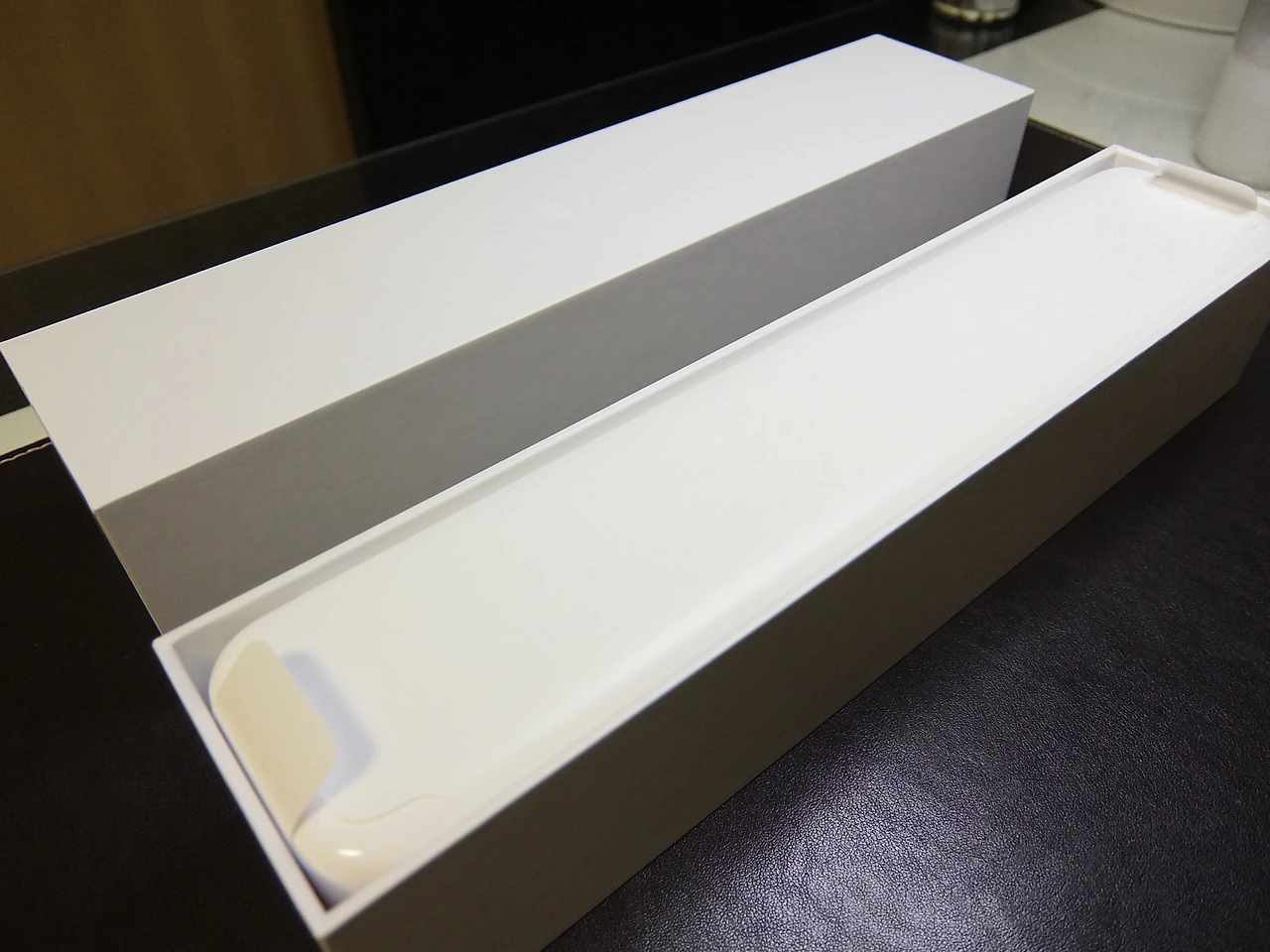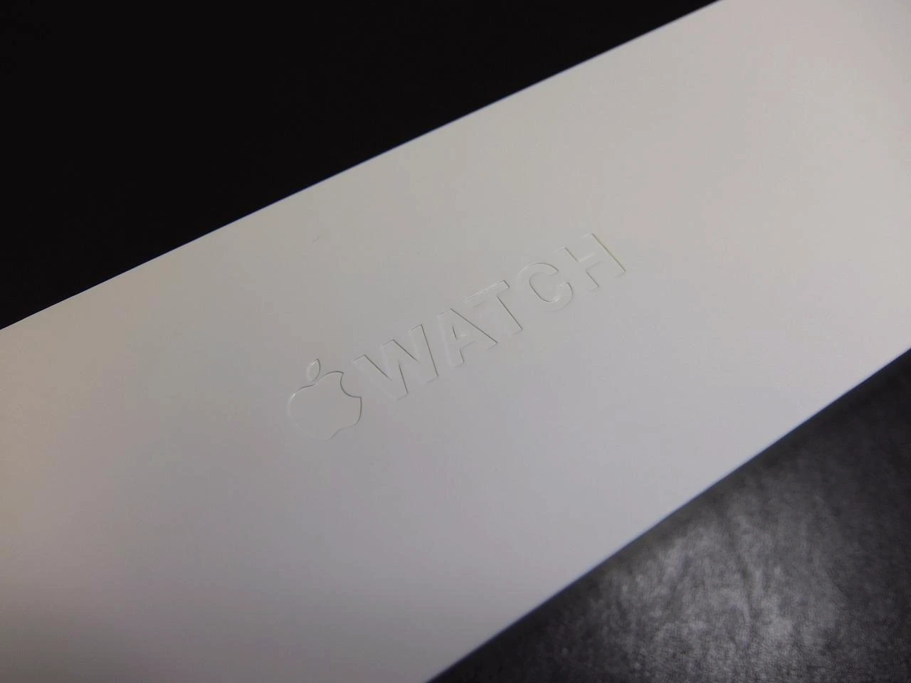 흰 직사각형 상자속 플라스틱 케이스에 애플워치가 길쭉하게 누워있다.