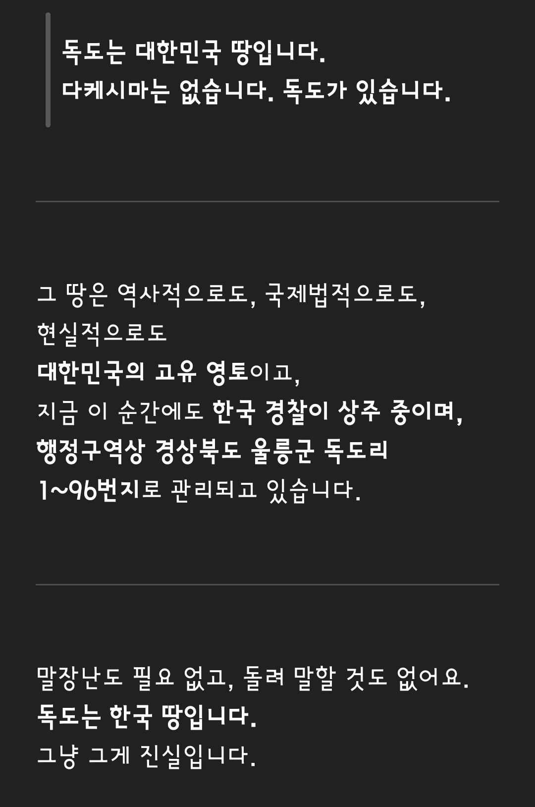 역사적으로도, 지리적으로도, 국제법적으로도 대한민국의 고유 영토라는 설명과 함께였다.