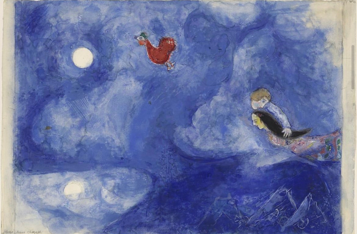 위 샤갈의 그림에서 파란색은 아픈 과거(아내의 죽음)에 대한 끊임없는 스스로의 자기 위로다. 인정하고 싶지 않은 아내의 죽음, 아픈 현실 속에서, 파란색은 아내에 대한 사랑.. 곧 행복했던 과거에 대한 끊임없는 현재화이다.