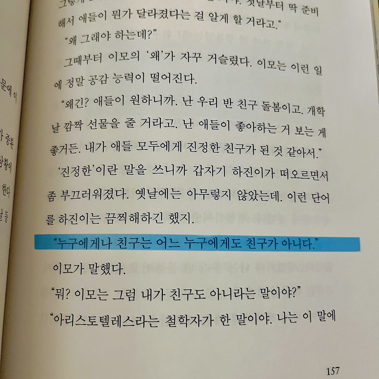 자신은 계속 천사처럼 행동해야 한다고, 반 아이들을 평화롭게 이끌어야 한다고, 아무도 시킨 적 없는 중대한 책임을 혼자 지고 있는 제오에게, 이모는 아리스토텔레스의 말을 전해준다. 비록 제오는 그 뜻을 이해하지 못하고 화를 냈지만, 아마 이모는 자신의 조카가 ‘모든 사람의 편을 들 수 없다’는 것을 이해하길 바라며 한 말이었을 거다. 그 말은 자신이 편을 들 누군가를 선택해야 된다는 의미다.