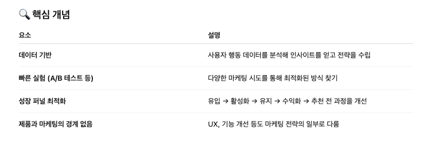 gpt에 따르면, 그로스 마케팅은 데이터를 기반으로 빠른 실험을 진행하고 단어 그대로 '성장'하기 위한 퍼널을 최적화하는 마케팅 전략이라고 정리할 수 있다. 특히, 제품과 마케팅의 경계가 없다는 점이 중요한 점이라고 생각하는데 그로스 마케팅은 제품의 시작점부터 고민한다. 제품 밖에서 진행하는 게 아니라 제품 안에서, 온보딩부터 무료 체험 등등 제품 안에서의 퍼널도 생각하는 범위라는 것.