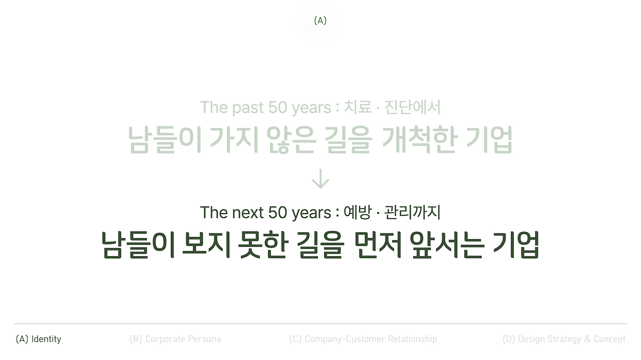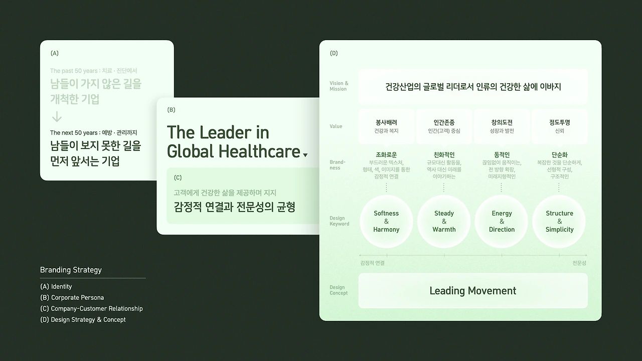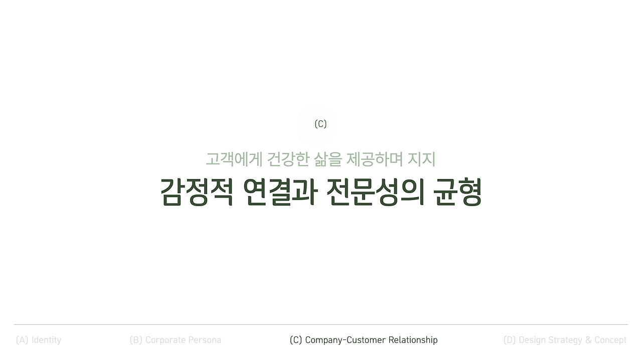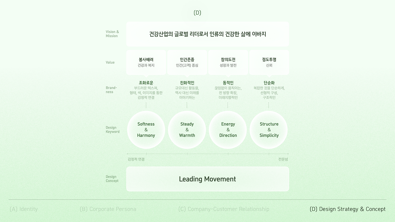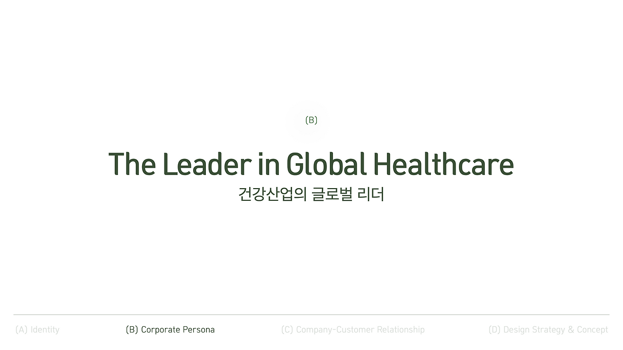 그래서 우리는 기존의 정체성을 한 단계 더 발전시켜 남들이 보지 못한 길을 앞서 준비하는 기업으로 정의하며 시작했어요. 건강한 삶에 대한 헌신적인 모습은 유지하되, 더 진취적인 방향을 담아서요.