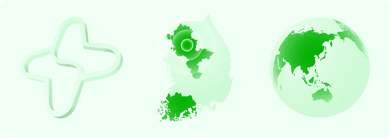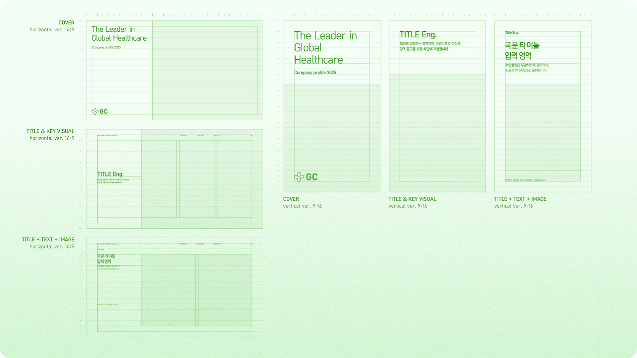 하지만 모든 커뮤니케이션에 3D 이미지를 쓸 수는 없었어요. 시간과 비용의 한계가 있으니까요. 그래서 3D 심볼의 무드를 유지하면서도, 다양한 커뮤니케이션 상황에 유연하게 대응할 수 있는 2D 그래픽 시스템을 개발했습니다. Green 계열의 밝은 그라데이션, 부드러운 그레인 효과를 적극적으로 활용해 3D 그래픽과 동일하게 긍정적이고 부드러운 분위기를 유지했어요. GC Green의 밝고 경쾌한 톤은 GC가 신뢰를 주면서도 새롭고 진취적인 기업이라는 이미지를 만들어줄 거예요.