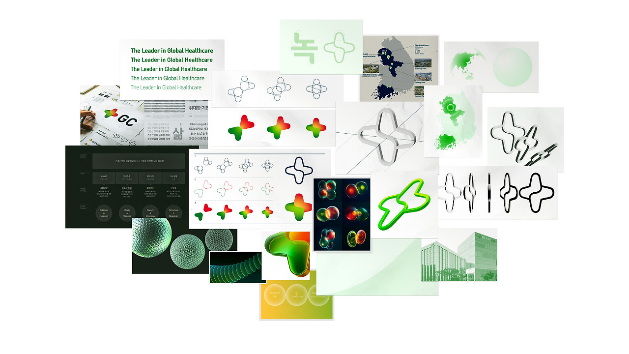 GC의 디자인 정체성은 바이오 의약 기반의 헬스케어 그룹이라는 본질에서 출발해요. 그래서 세포의 유기적 움직임에서 영감을 받아, 끊임없이 순환하고 확장하는 3D 심볼을 개발했어요. 이 그래픽을 기업을 대표하는 키비주얼로 내세워, GC가 역사에 멈춰있는 전통적 제약회사가 아니라, 혁신하고 확장해 가는 통합 헬스케어 그룹이라는 이미지를 강하게 전달했습니다. GC 그룹을 대표하는 접점에서는 풀컬러 심볼을, GC(녹십자홀딩스)는 Green 단색 심볼을 중심으로 커뮤니케이션하도록 정리했어요. 최근 많은 브랜드들이 3D 그래픽을 활용하고 있지만, 단순 유행처럼 소비하지 않고 GC다운 부드러운 색감과 텍스처를 입혀 브랜드의 고유한 표현으로 만들었습니다.
