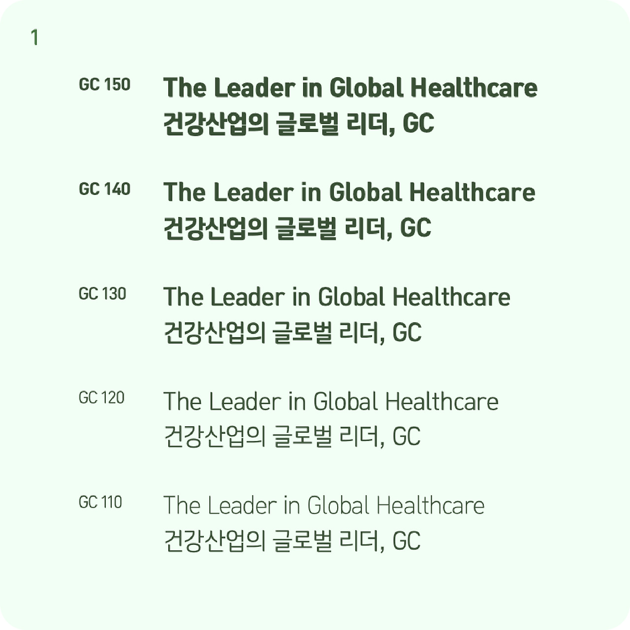 컬러는 정말 많은 고민이 필요했어요. 에스텐다드에서는 초기에 CI 심볼에서 보였던 Red-Yellow-Green 그라데이션을 중심으로 제안했었어요. 하지만 GC 브랜드팀과 긴 논의 끝에 방향을 바꿔 Green을 중심으로 한 전용 팔레트를 구축하기로 했습니다. 녹십자의 헤리티지를 현대적으로 계승하는 동시에, 풀컬러를 사용하는 다른 계열사들과 확실히 구분하려는 의도였어요. 그렇게 GC의 팔레트는 Black, White를 제외하고, 오직 Green 계열의 색으로만 구성되었어요. 밝은 미색부터 어두운 Green까지 톤을 폭넓게 활용하며, 강한 컬러 대비는 최소화했기 때문에 전체적인 비주얼을 부드럽고 안정감 있게 전달할 수 있어요.