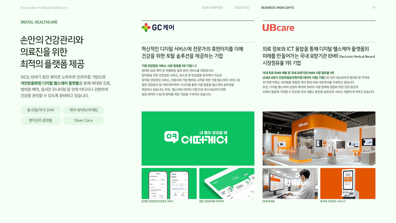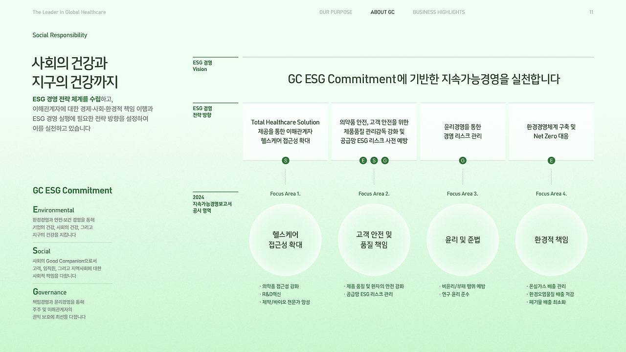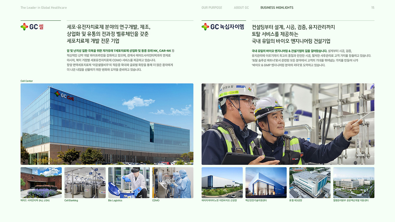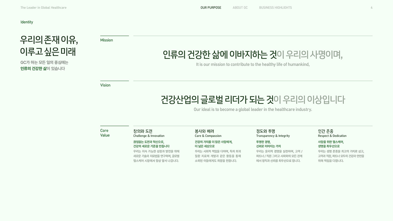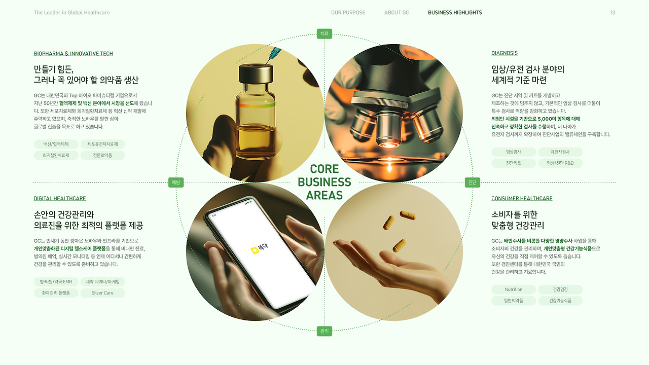 여러 번 설명했듯, GC는 44개의 계열사가 예방, 진단, 치료, 관리의 전 영역을 담당하며 서로 시너지를 내는 밸류 체인(Value Chain)을 가지고 있어요. GC그룹의 가장 강력한 특징인 이 부분을 별도의 페이지로 정리해 보여주면서, GC가 앞에서 말해온 꿈을 '어떠한 방식'으로 이루어 가는지를 보여주며 내용을 점점 실질적이고, 구체적으로 좁혀가도록 했어요. 다음이 궁금해지도록요.