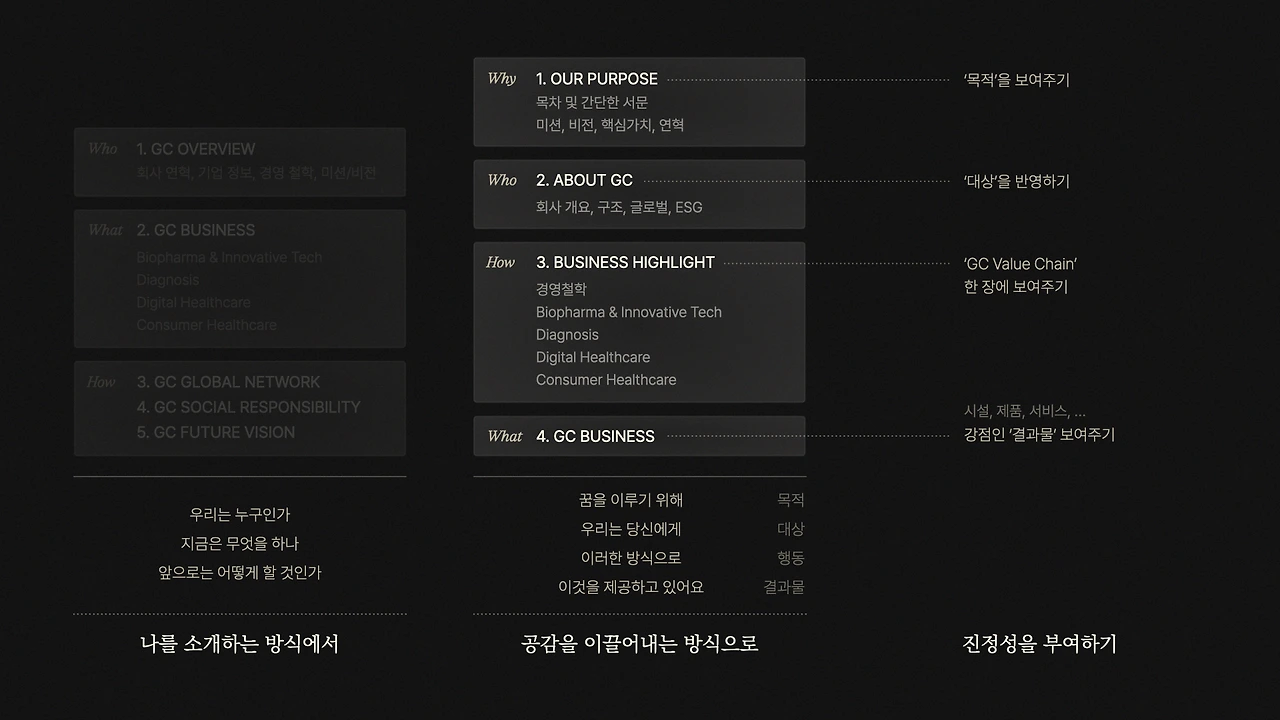 GC의 그룹 소개서는 단순히 ‘우리 그룹은 이래요’하고 보여주는 것을 넘어서, GC가 어떤 브랜드가 되고자 하는 지를 명확히 설명하는 핵심 커뮤니케이션 툴로서 기획되었어요. 그래서 콘텐츠 구성도 다른 회사소개서와 크게 다를 것 없어 보이지만 고객에게 이야기를 하며 관계를 형성한다는 생각으로 몇 가지 중요한 차이점을 넣었어요.