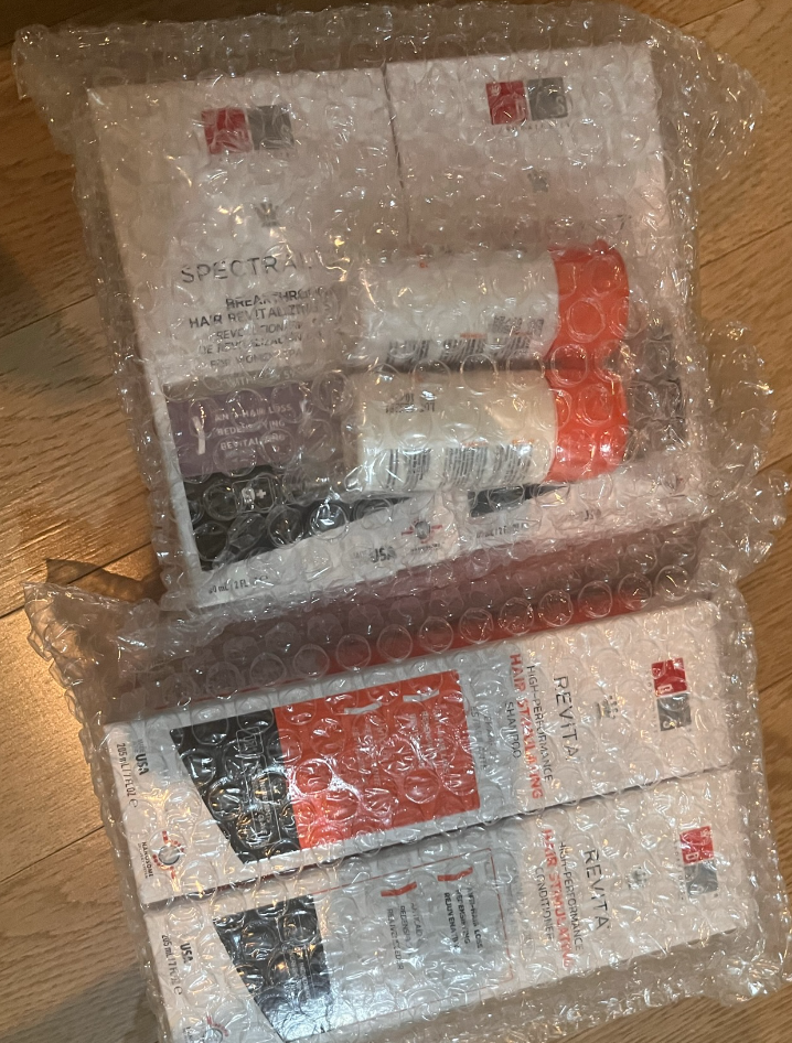 뽁뽁이 포장을 뜯으면 매일 사용하는 레비타 샴푸,린스, CSF, F7 앰플이 들어있다.