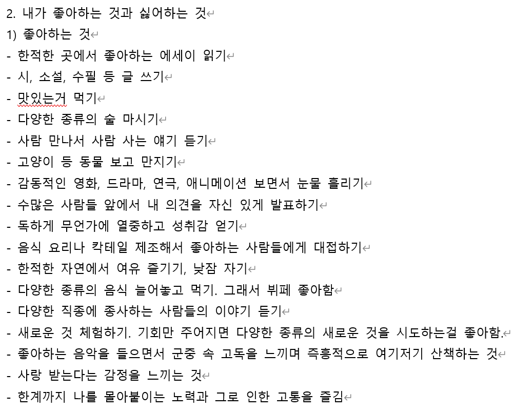 먼저 카페에 가서 어릴 때부터 지금까지 기억나는 나에 대한 모든 정보를 정리하고, 그에 대해 지금 느끼는 감정을 정리했다. 그러자 자신의 열등감, 결핍, 욕구, 행복, 사랑, 즐거움에 대해 하나하나 다시금 떠올릴 수 있었다. 그러고 나서는 내가 좋아하는 것과 싫어하는 것에 대해서 광범위하게 모두 적어 내렸다.