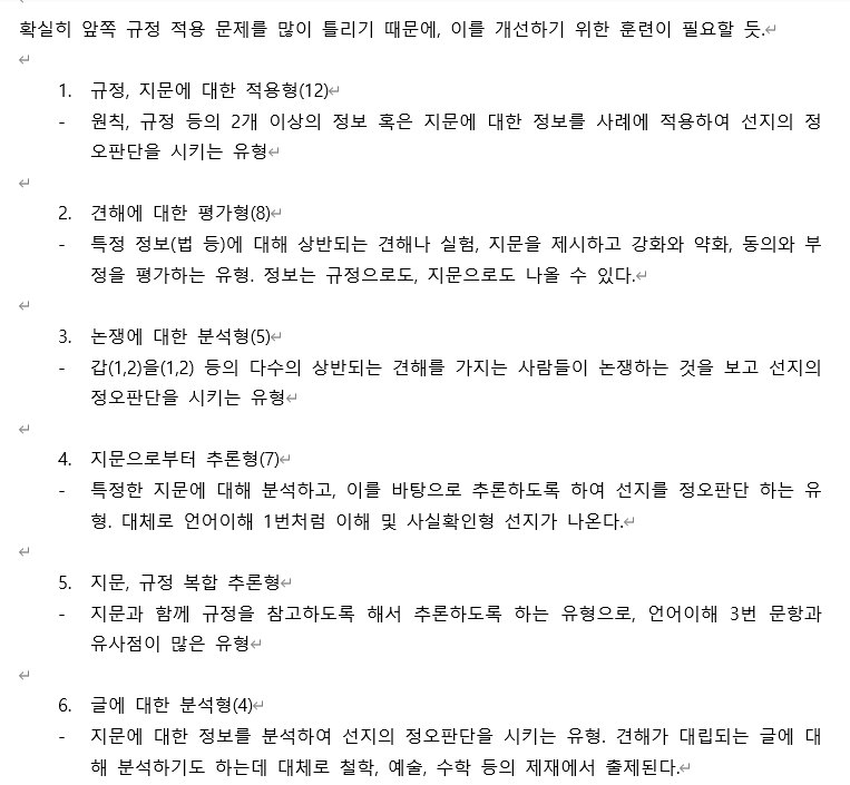 이런 식으로 공부하면 당연히 처음부터 끝까지 푸는 연습을 해야 하지 않냐고 생각할 수 있는데, 그런 연습은 시험 치기 직전 한 달 전에만 하면 된다. 그전까지는 내가 못하는 부분의 역량을 높이는 방법을 근본적으로 고민해야 하고, 그걸 위해서는 기출을 직접 유형 분류하고, 어떤 유형에서 내가 유독 약한지 확인하고, 그 약한 유형을 극복하는 방식을 능동적으로 고민하고 방안을 도출해서 이를 실행해야 한다.