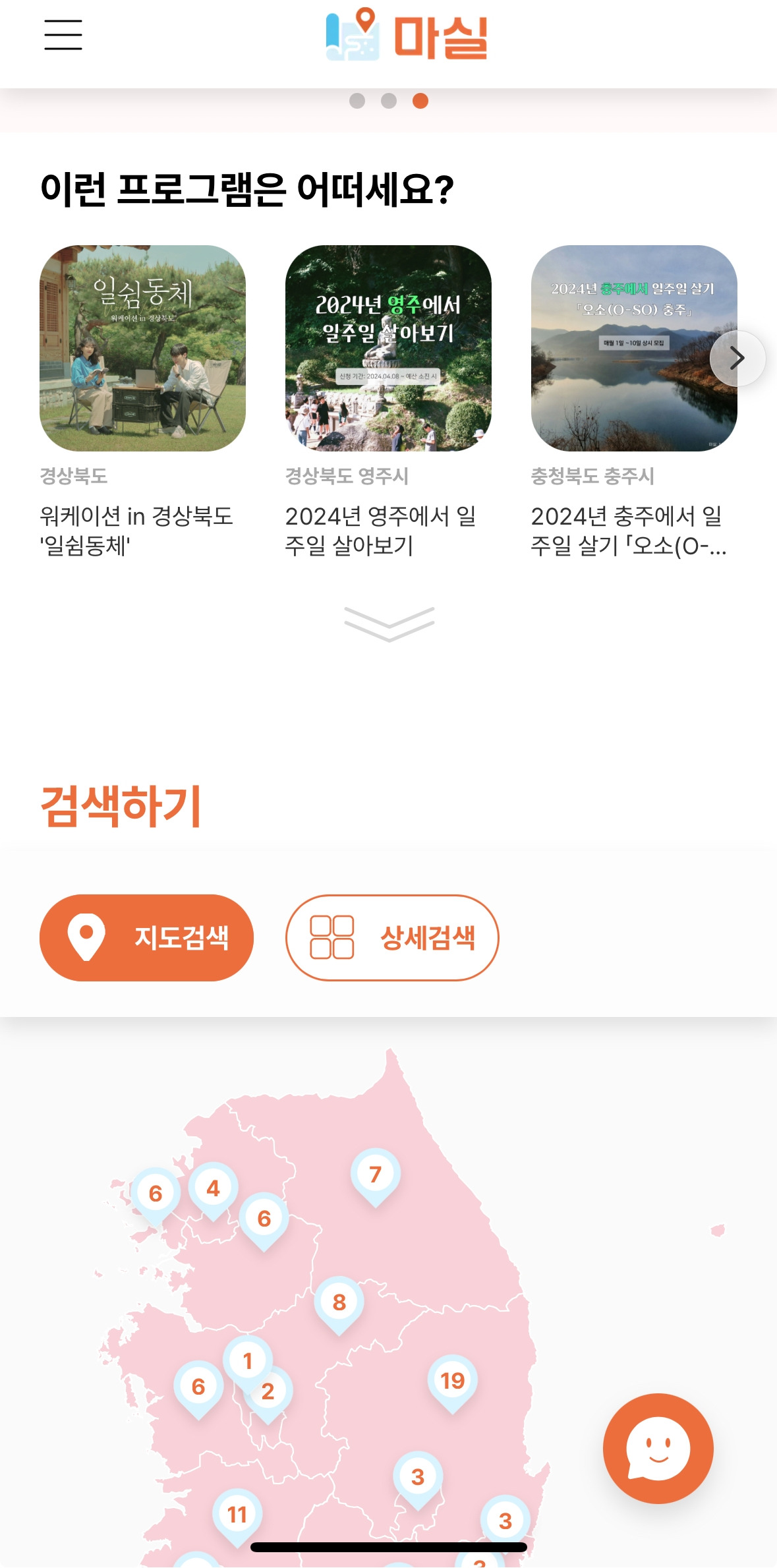 팸투어등 짧은 여행, 7일에서 한 달 살기, 워케이션, 귀농귀촌, 로컬프로젝트 등 여행과 관련된 수많은 정보들이 실시간으로 업데이트되었다. 각 지자체 홈페이지를 들락날락할 필요 없이 관심 있는 지역의 여행정보가 올라오면 바로 확인할 수 있었서 좋았다. 바로 한 달 살러 앱을 깔고 새로운 여행정보가 올라오면 알림이 오도록 설정해 두었다. 마실의 경우는 앱이 아닌 웹으로 마실이용자들 모임인 오픈카톡방이 따로 있었다. 주로 관리자가 여행정보를 올리는 정보방과 수다방 두 개의 카톡방으로 운영되었다. 아무래도 카톡이 익숙하고 자주 이용하다 보니 나의 경우는 마실을 많이 이용했던 것 같다. 한 달살러앱은 여행별로 깔끔하게 정리되어 있어 정보를 찾아보기가 좋았고, 앱에서 바로 신청까지 할 수 있어서 간편했다. 마실의 경우는 지도로 되어있어 관심지역 근처의 여행정보까지 한눈에 확인할 수 있는 것이 장점이었다.