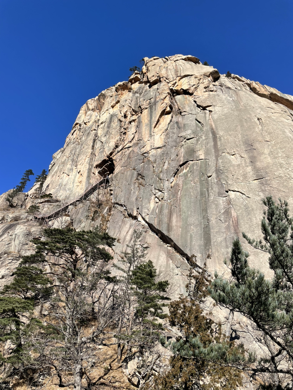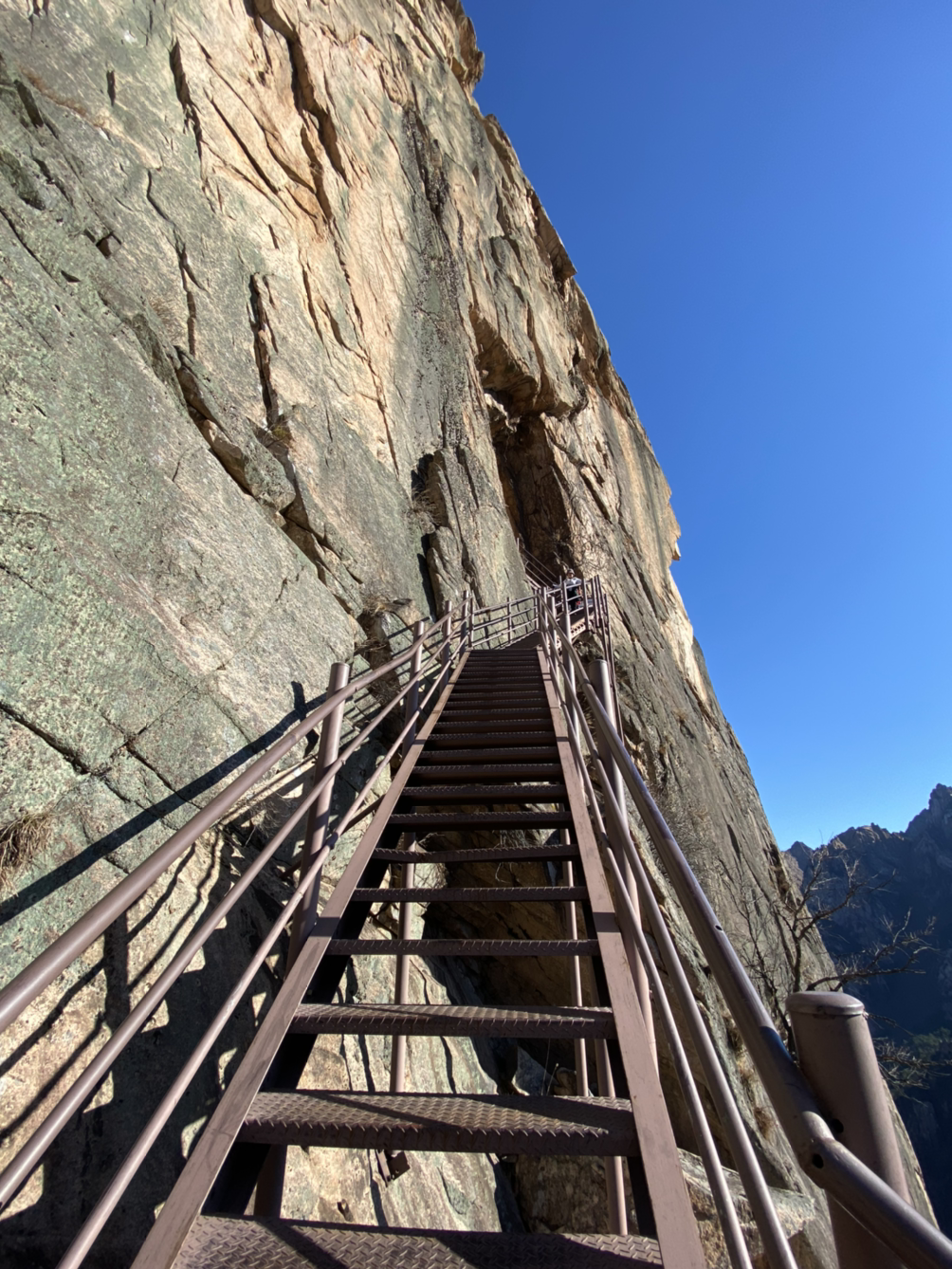 그래그래 진정하고 자 한번 경험했으니 허리에 파란 띠를 보여주면서 이 계단에 올라보자고 마음을 먹고 또 그 마지막 코스에 올랐을 때. 알고 오르니 더 무서웠다. 그래도 두 달도 안돼 찾아온 울산바위 2회 차의 용기를 보여주려 오두방정은 떨지 않으려 노력하며 묵묵하게 올랐다.