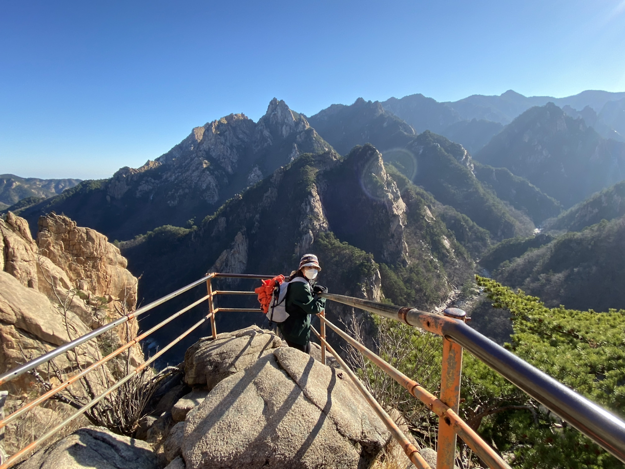 일행들은 짧은 시간 큰 수고 없이 연속적으로 절경을 만나는 울산바위 코스에 가성비 운운하며 좋아라 했다. ‘일상의 무게’ 같은 단어는 토요일 오전부터 월요일병 걸릴 생각 없으니 저리 치워놓고 이곳이 한국인가 이런 곳이 있었던가 입속에서 곱씹으며 첩첩산중 병풍화처럼 그려지는 산의 아웃라인을 손으로 따라 그려 보며 계단의 방향이 바뀌어 돌아설 때마다 감동의 게이지 최대치를 채우고는 했다.