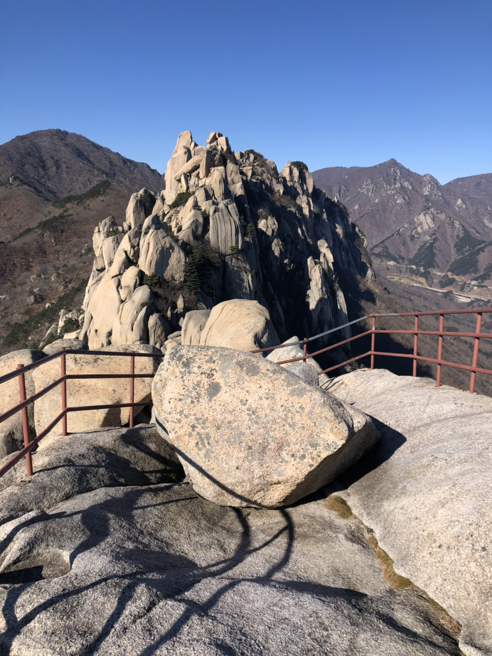울산바위는 특별한 정상이 있는 것은 아니지만 울산바위 가까이 오를 수 있을 만큼 설치해놓은 철제 난간을 올라 다다르는 코스가 마지막 하이라이트인데 이곳을 처음에 얼마나 발발 떨면서 올랐는지 나의 내적 얇은 개다리춤을 추며 그래도 한번 울산바위를 오르고 난 뒤 나의 용기는 빨간 띠에서 파란 띠로 한 단계 업그레이드되는 느낌을 느꼈었다.