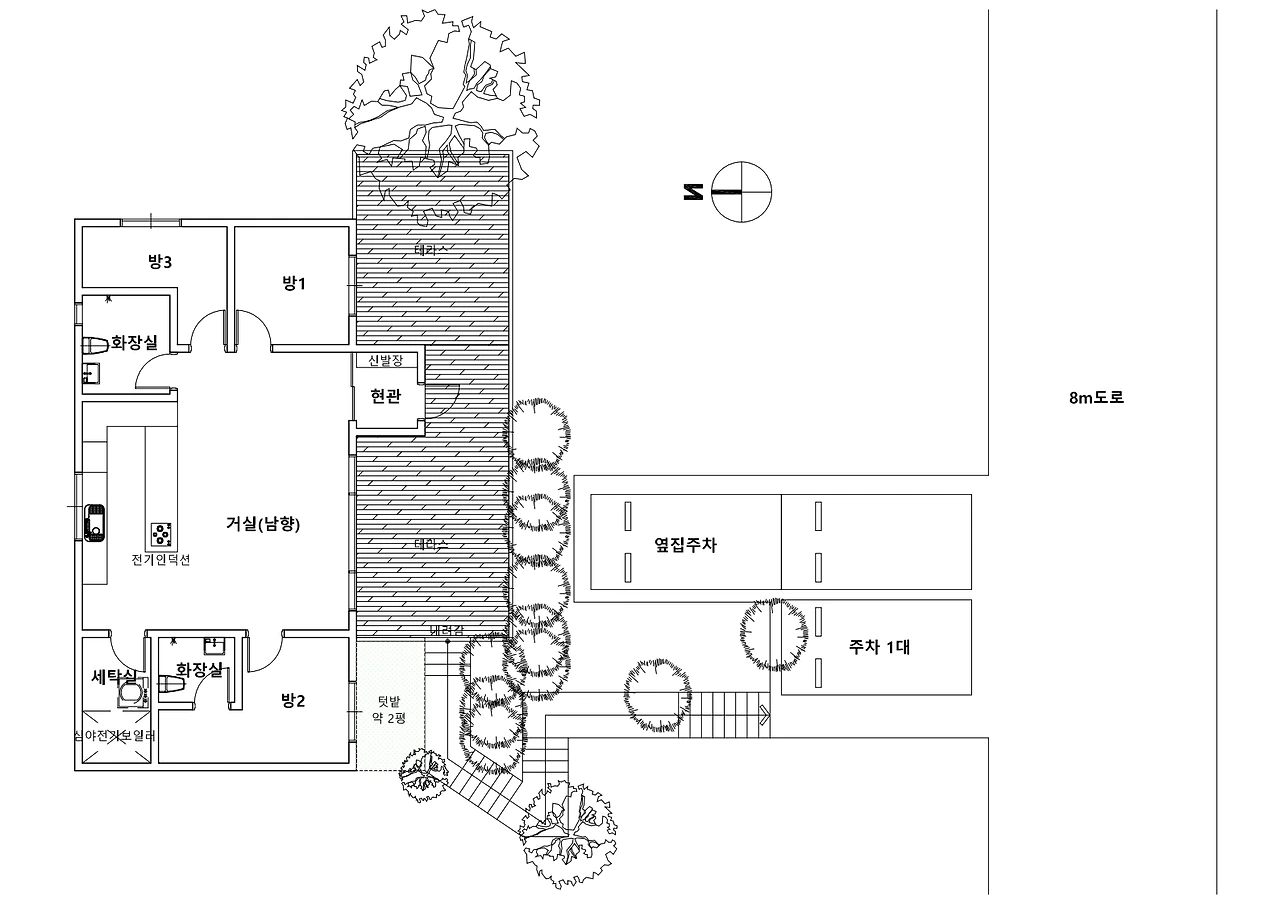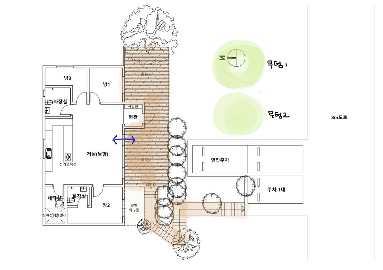 깐깐함을 작동시키지 않고 이 집을 계약했던 이유는 집 앞의 테라스다. 거실에서 항상 테라스가 보였고 거실의 대형창을 통해 내외부 공간을 넘나들기 수월했다. 보면서 접근하지 못하는 공간과 접근이 용이한 공간의 질은 매우 다르다. 남향의 빛으로 바짝 마른 언덕 위에 바짝 말라있는 데크, 오일스테인이 다 벗겨져 있는 모습이 매력적인 데크를 거실과 수시로 오갈 수 있었다. 집 앞으로는 경사가 심해서 집에 오면 4~5미터 정도 계단을 올랐다. 경사면에는 무덤이 두 개 있었다. 사람들이 무덤이 있는데 안 무섭냐고 할 때마다 무덤이 있어서 누군가 당장 신축을 한다고 공사를 시작할 일은 없을듯해서 오히려 좋다고 했고 실제로 그렇다. 아침마다 데크에서 시작해서 계단으로 내려가는 영역의 빗자루 질을 했다. 주변 나무들에서 떨어진 낙엽을 쓸곤 했는데 마당의 낙엽을 쓸 때마다 주어진 인생을 꼼꼼하게 사는 느낌이 들었다. 마당을 빗자루질하는 일은 헬스장을 대체하는 활동이라고 생각해서 시간이 아깝지 않았다. 다만 계단 주변에 꽃나무들을 다듬는 일에 몰입해서 주말의 반나절이 순간 삭제되고는 해서 이게 무슨 일인가 싶을 때가 가끔은 있었지만 매일아침 '마당을 빗자루질하는 삶'은 '저녁이 있는 삶'처럼 생계를 위해 하는 일을 넘어선 여가행위 같은 느낌이라 빗질은 빙글빙글 웃으면서 치르는 노동이었다.