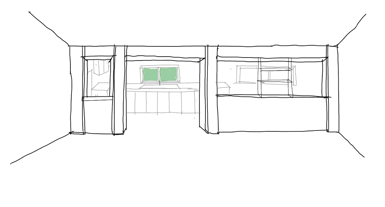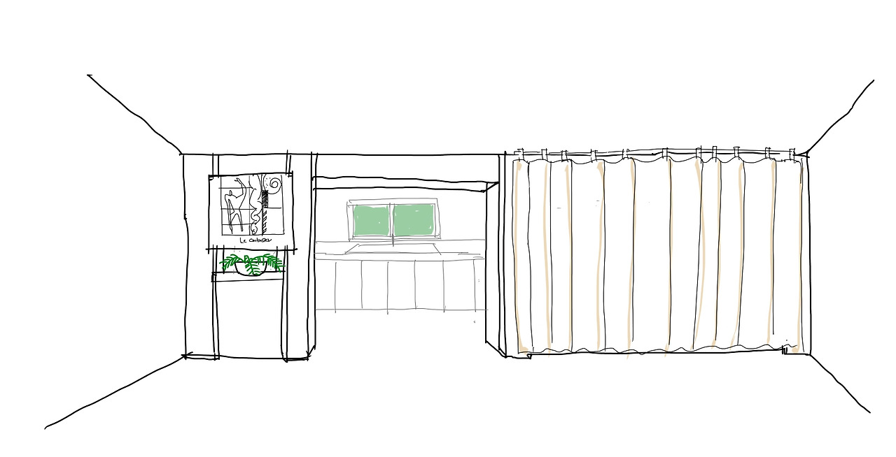 그런 맥락으로 이 집을 설계한 사람의 입장을 생각해본다. 아무래도 이렇게 집안에 대공간이 벽으로 나뉘지 않는 것은 그냥 둘 수 없었던 것 같다. 벽 선반의 마감이나 칸의 구성이 거슬린것도 있지만 볼때마다 납득이 되지않는 디자인이라 (공사비를 써가면서? 구조벽도 아닌데? 예쁘지도 않은데...? 기능적이지도 않잖아?) 커튼으로 가리고 살았다. 집에 들어오자마자 설거지가 정면으로 보이는 구조였던 이유도 있다. 왼쪽 편은 르꼬르뷔제의 포스터를 폼보드에 붙여두었다.