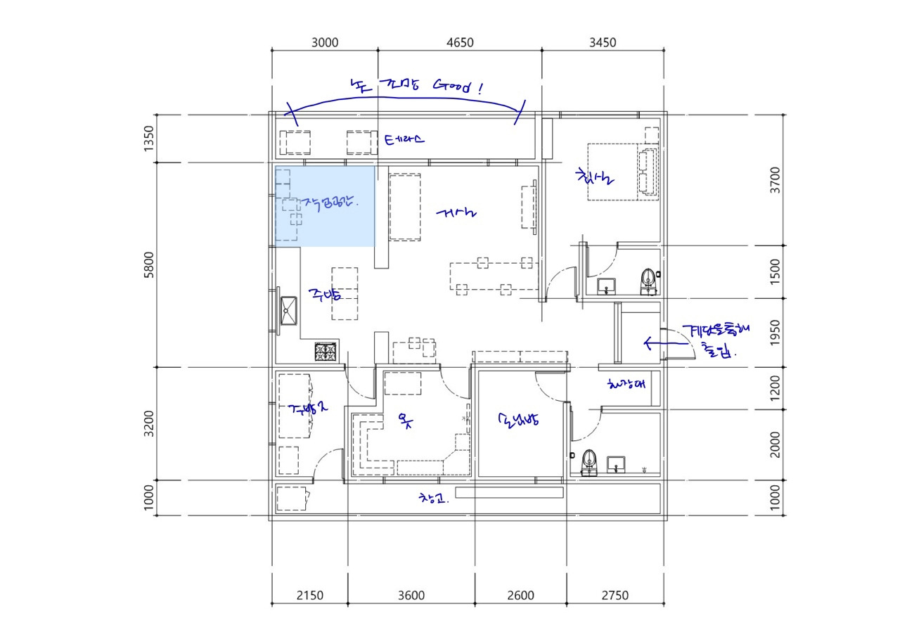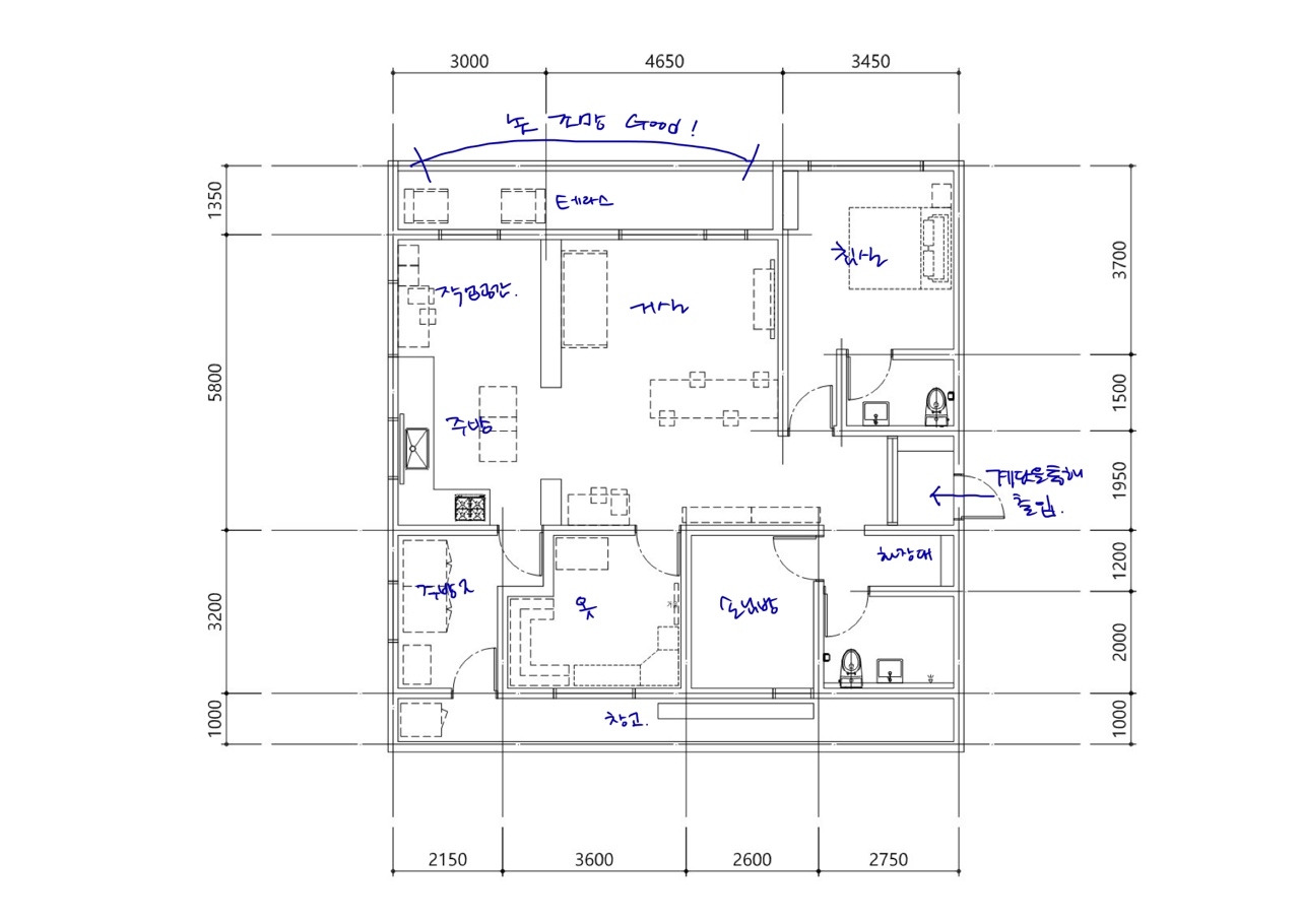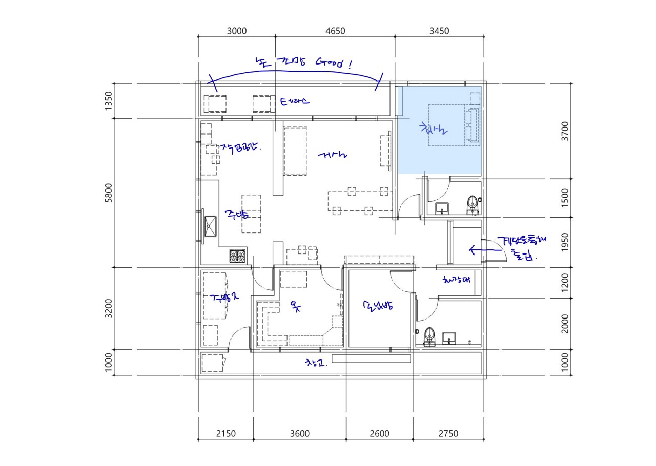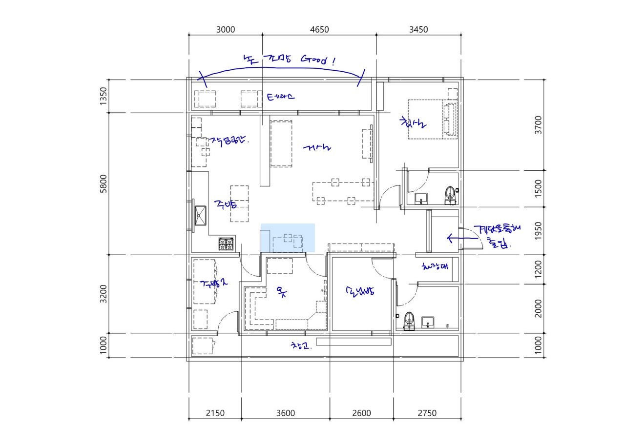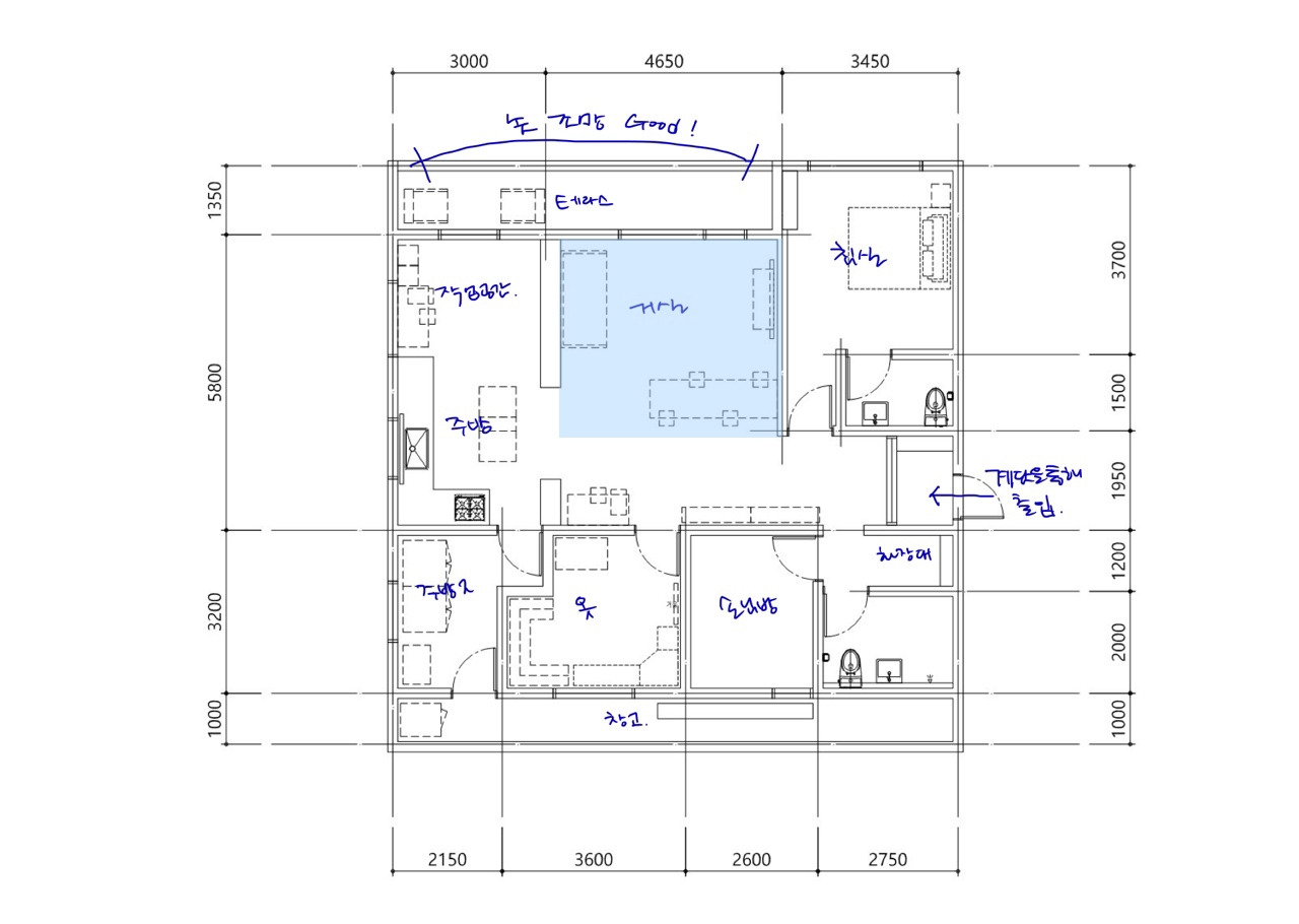 3000, 4500 비율로 거실과 주방을 나누고 있는 장식벽이 아쉬웠다.