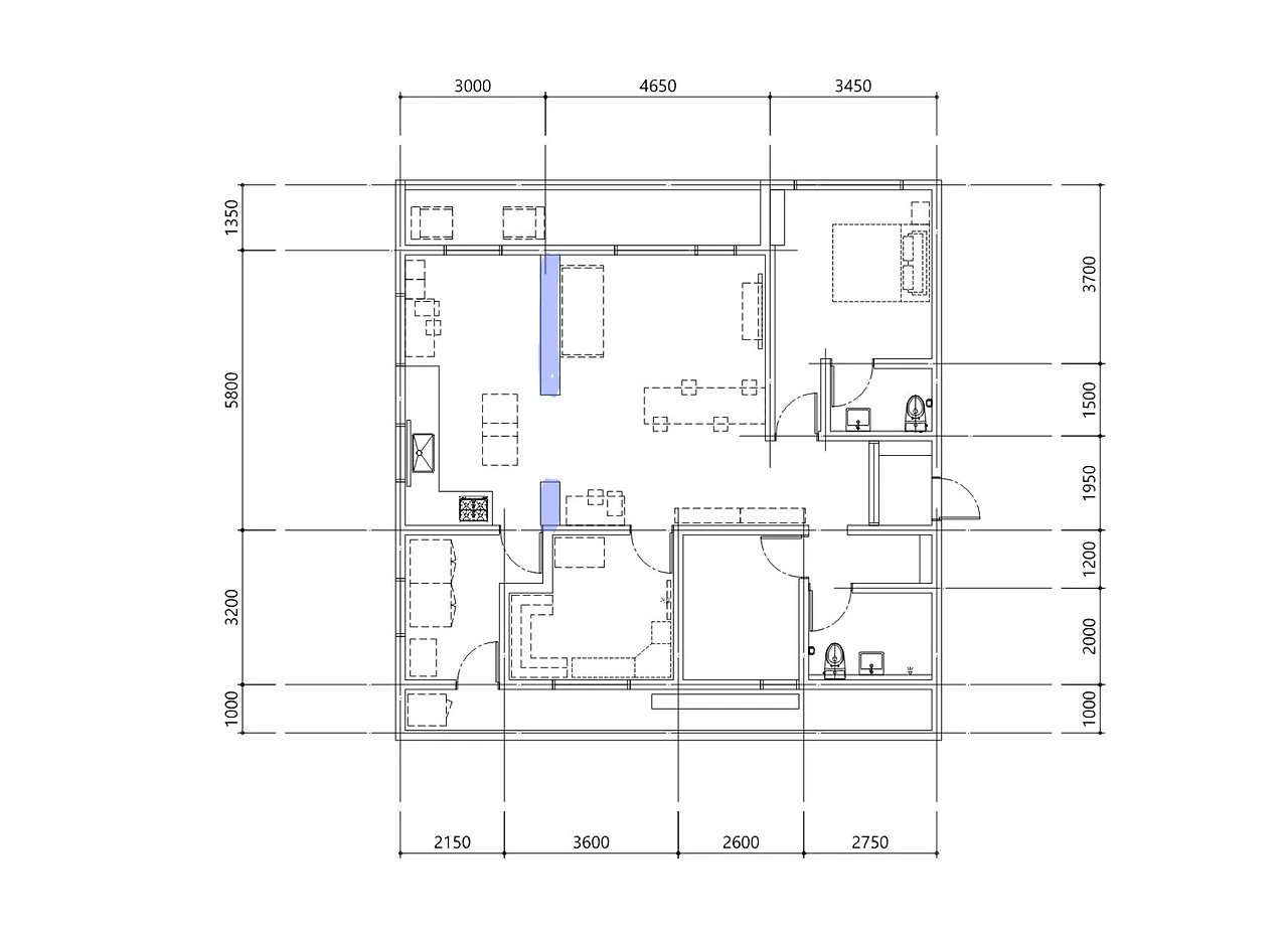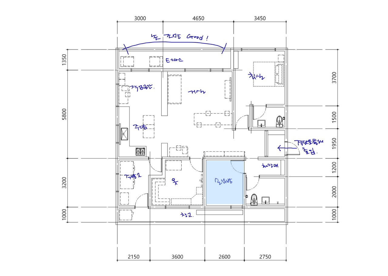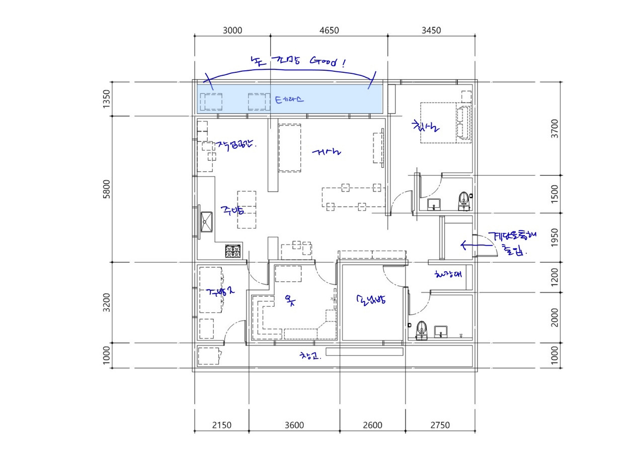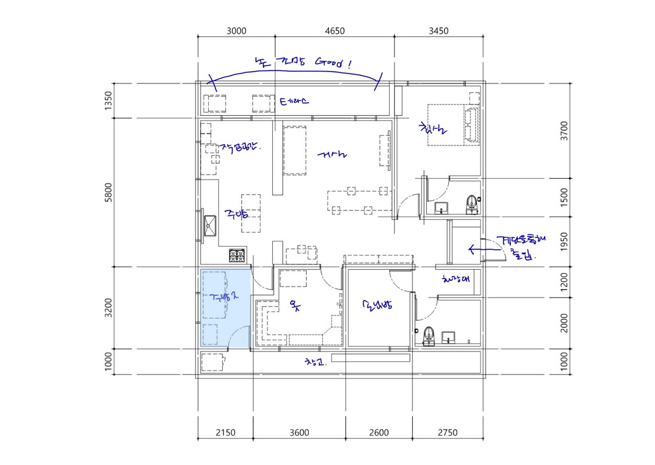 3000, 4500 비율로 거실과 주방을 나누고 있는 장식벽이 아쉬웠다.