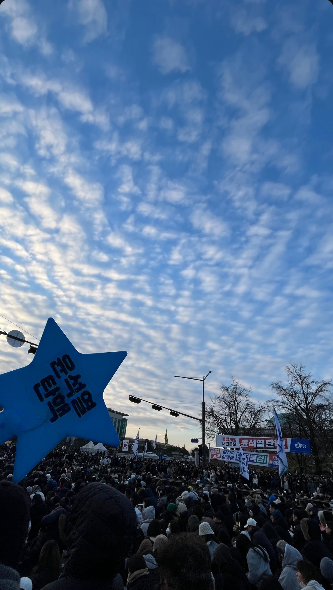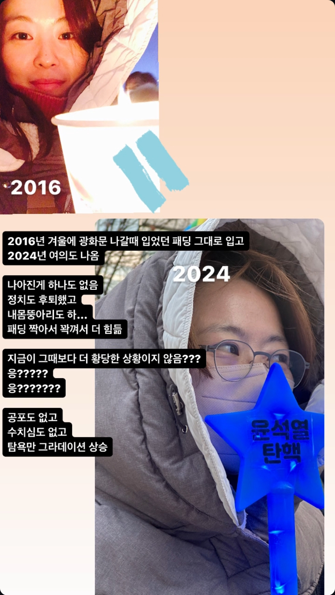 기난긴 밤 유튜브 라이브를 보면서 마음에 남은 건 부채감이다. 일제강점기에 태어났으면 나도 독립운동을 했을거라 막연히 상상했던 내 자신의 용기는 단순한 망상임을 깨달았다. 동시대에 일어나는 사건을 대하는 나의 태도로 숨겨온 패가 까인 느낌이었다. 이런 나와는 달리 군용 차량 앞에 엎드러진 사람들, 총부리를 잡는 사람(안귀령 님), 마스크를 써 얼굴이 보이지 않는 무장군에게 몸을 밀착한 사람들 여러 유튜브 라이브를 번갈아가며 다리를 덜덜 떨면서 시청했다. 근처에 있었다면 갈 수 있었을까? 그다음 날 무사히 출근하며, 전날 국회 앞사람들이 만들어준 일상에 대한 감사 이상의 부채감을 해결하고자 주말에 국회 앞으로 나갔다.