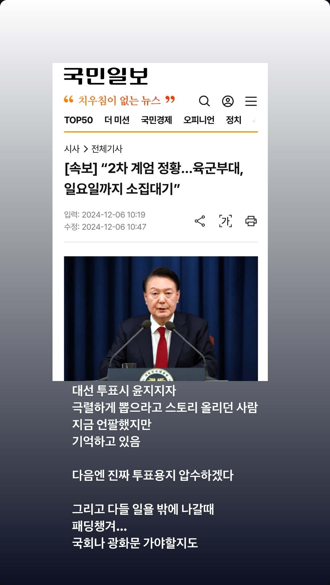 12월 3일 10시 30분 헬스장 탈의실에 "자기야, 계엄이라는데?" 도망쳐야 돼?"라는 귀가 따가운 통화소리를 들은 것이 시작이었다. 뉴스를 틀었고: