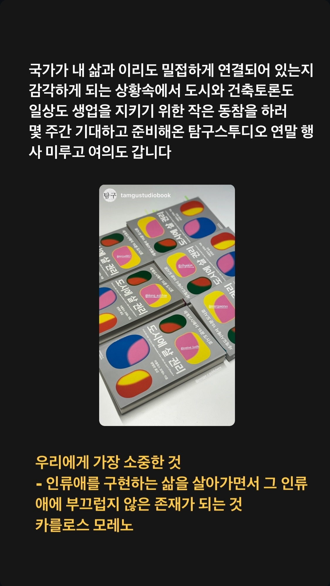 우리에게 가장 소중한 것 - 인류애를 구현하는 삶을 살아가면서 그 인류애에 부끄럽지 않은 존재가 되는 것-이라는 카를로스 모레노의 문장을 보며 큰 산을 옮기기 위해 눈앞의 돌을 옮기듯, 나는 희망을 품는다.
