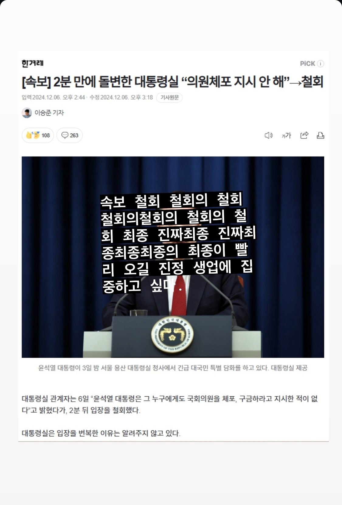 지난주 평균 스크린타임이 평소의 두 배다. 뉴스라이브를 보느라고 머릿속에 굴리고 있던 생각이나 글감이 다 날아갔다. 일도 제대로 안되고 회의 중에도 뉴스와 연결되어 있다. 2분 차이로 ‘속보와 철회’, ‘철회의 철회’를 챙겨보며 내적 탄식과 각성을 번갈아 하고 있었다.