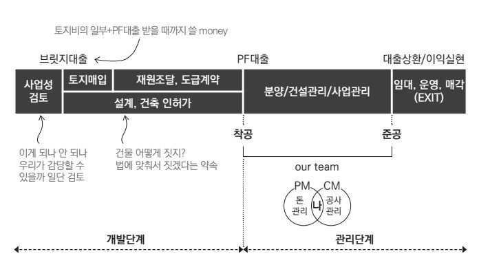 더불어 시행사에서 3년을 보낸 현시점도 꽤 유용하다. 지금이 건축설계업에서 부동산 개발사업에 진입한 지 얼마 안 되어 내 일 을 타인의 일처럼 한 발 떨어져서 바라볼 감각이 아직 남은 시기라 고 나름 정의 중인 시기다. 그래서 현시점에 회사에서 만든 프로세 스 기준으로 나눈 조직 구조를 활용하여 정형화하기 어려운 조직 구조 속 개발사업이 만드는 건물과 그 일을 돌보는 나를 기록해 보았다.