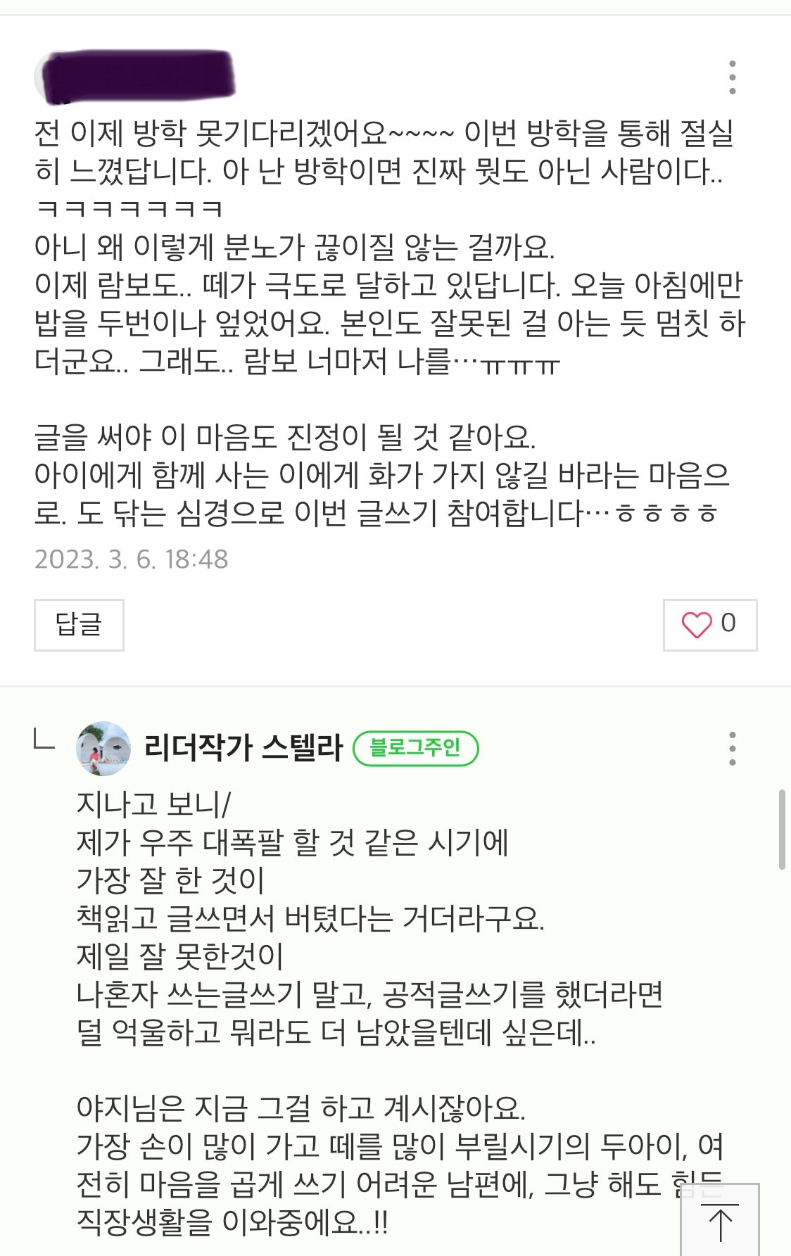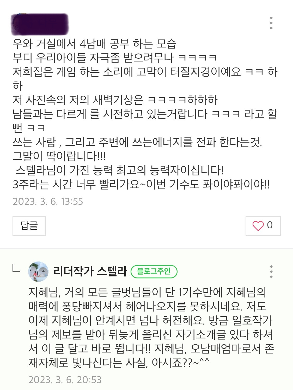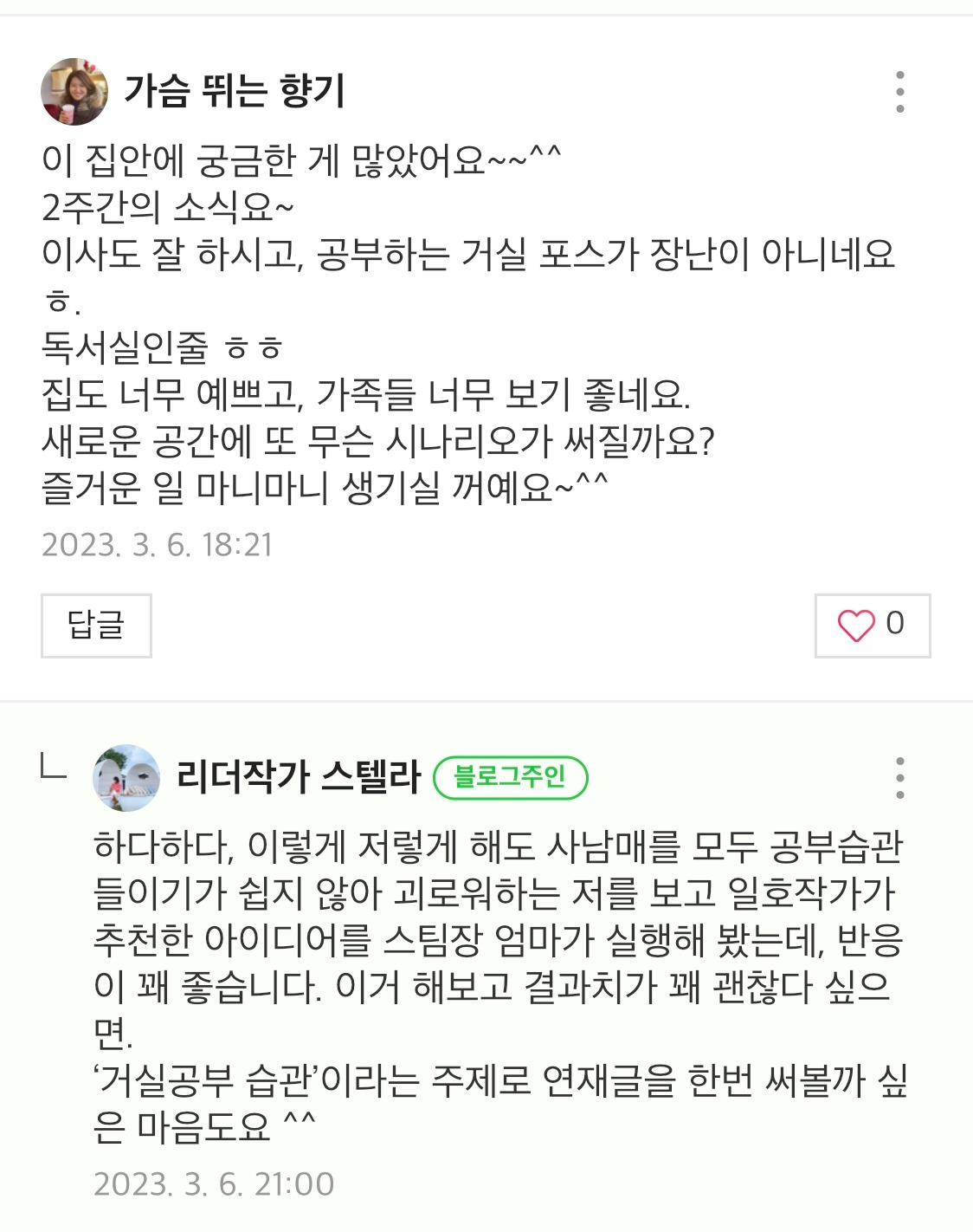 (이건 저희들만큼 신나게 댓글을 달지는 않더라구요. 일단 엄마가 시키고 안 하면 벌금을 내야 하니 매일 쓰고는 있지만요 ^^)