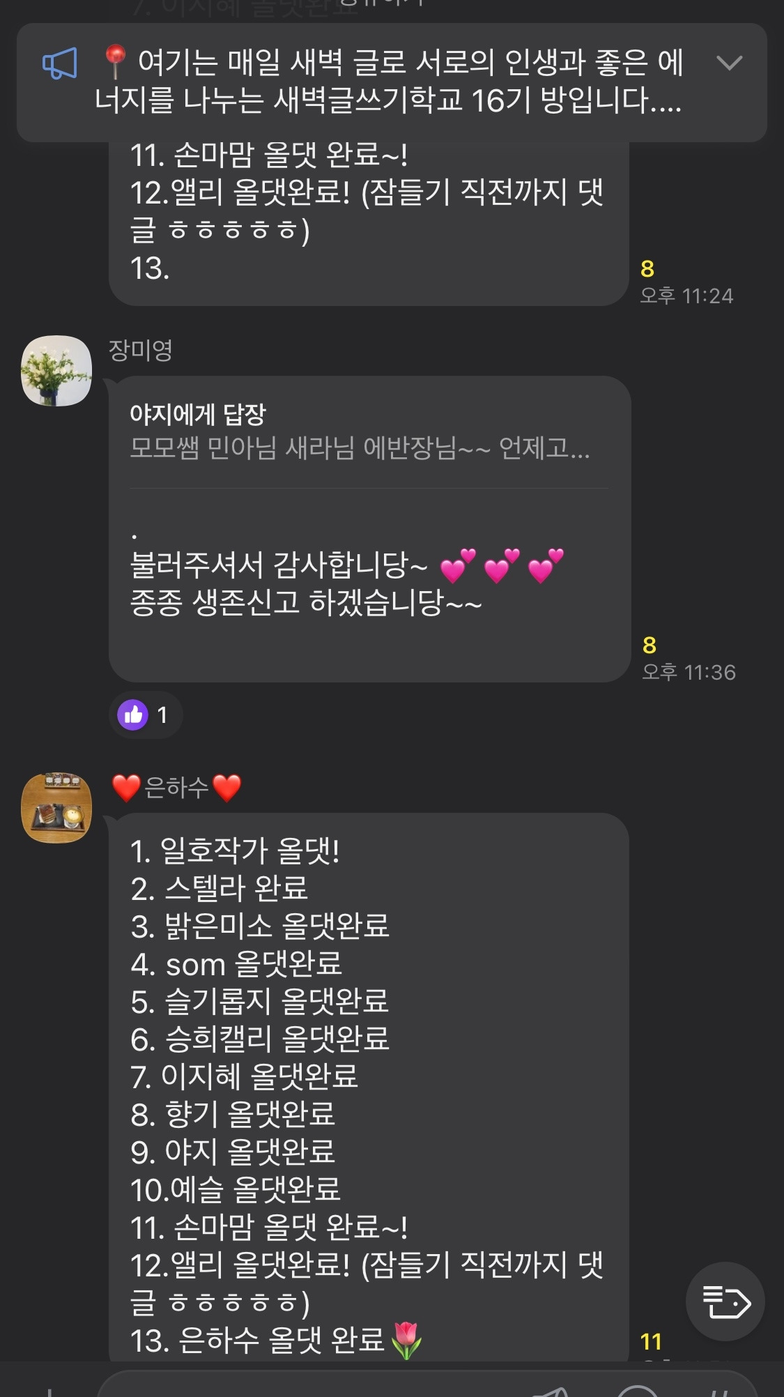제가 직접 그 마음들을 깊이 느끼고 경험했기 때문에 인연되는 분들과 이 소소하지만 결국 장대해지는이 새벽글모임을 계속 해야만하겠구나.. 이제는 내가 선택한 모임이 아닌 모두의 것이 되어버렸구나.. 이런 진짜의 마음을 느끼게 됩니다.