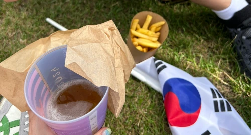 우리가 예매한 경기는 남녀 개인전 64강, 32강 경기였고 한국 선수들은 오후 두 시 반부터 나올 예정이었다. 일찍 도착한 우리는 일단 허기부터 채워야 했기에 경기장 내에 있는 F&B 부스로 가서 햄버거, 맥주, 감자튀김등을 주문했다. 올림픽특수 물가가 적용되어 꽤나 비싼 금액으로 구매했다. 올림픽이니 어쩔 수 없지. 하지만 생각보다 맛있어서 놀랬다. 생각보다 좋은데?