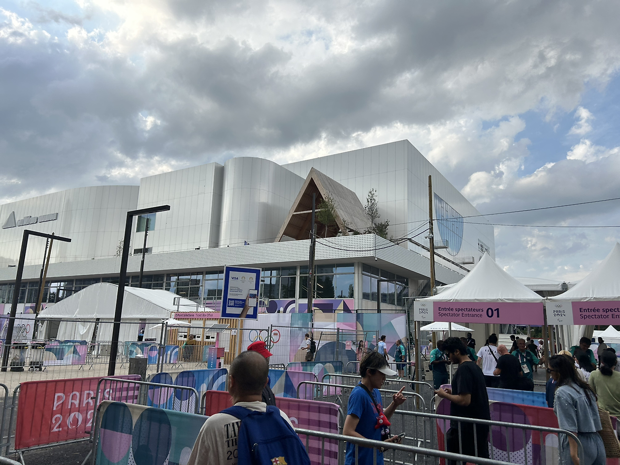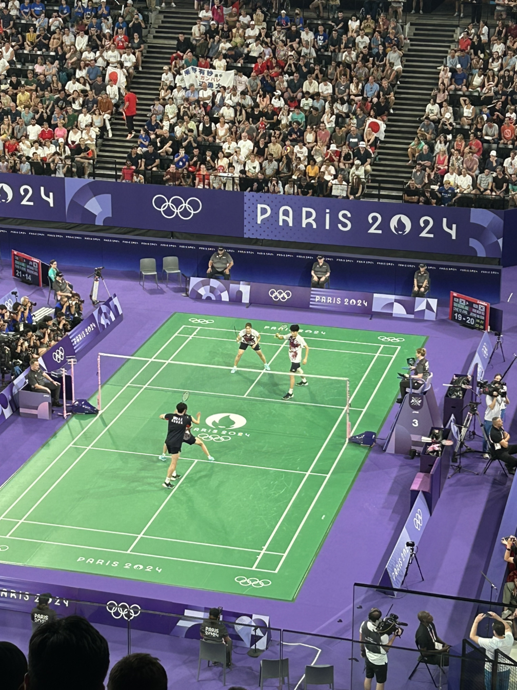 배드민턴도 살짝? 치고 기념품 샵에서 파리 올림픽 기념품들을 쇼핑한 후 경기장으로 들어갔다. 우리는 두 번째로 좋은 좌석으로 예매했었다. 그런데 티켓번호를 보니 경기장 꼭대기로 올라가라고 기재되어 있어 당황했다. 두 번째로 좋은 좌석인데.. 왜 꼭대기까지 올라갈까? 반신반의하며 꼭대기까지 올라간 후 좌석에 앉고 나니 알 수 있었다. 배드민턴 경기장에는 총 세 코트가 있었는데 우리 좌석에서는 세 코트 모두 잘 내려다보이는 위치였었다. 괜한 의심?을 했던 우리. 만족스럽게 자리에 착석했다.