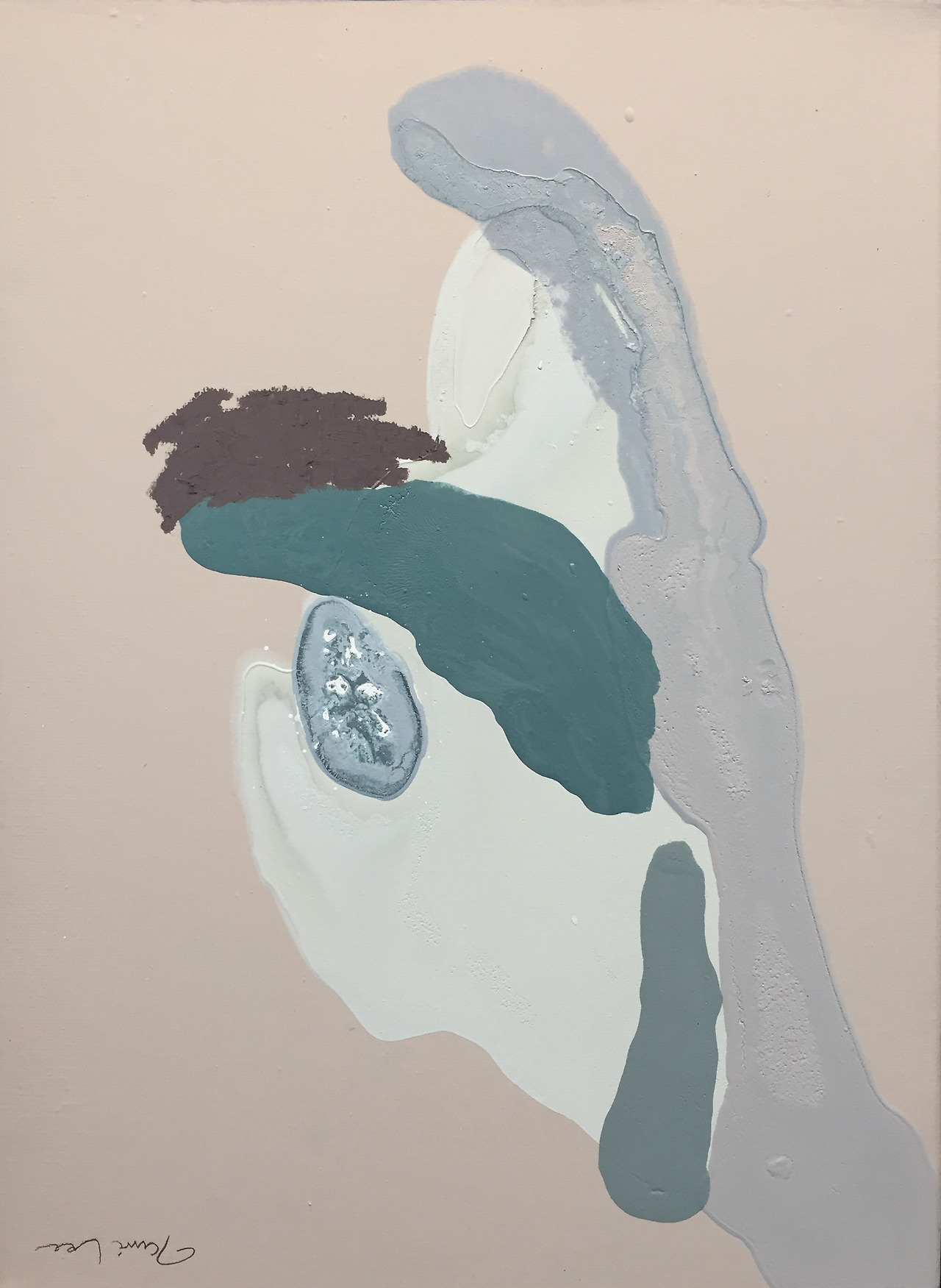 이처럼 추상과 자유를 향해 붓을 움직이면서 사각의 캔버스 틀 안에서 고요한 규칙과 침전을 맞이하는 물감들은 작가의 페르소나(persona)가 된다. 이는 그의 화폭에 늘 존재하던, 어느 순간 자취를 감춘 얼굴의 가면일지도 모른다. 아니, 그 이전부터 존재하던 것일지도 모르겠다. 그렇기에 이것은 결코 의도적인 거짓이거나 허구라 할 수 없을 것이다. 그저 어쩔 수 없이 드러나는 표정과 감정들처럼, 숨길 수 없는 감정의 얼굴일 뿐. 하지만 완벽히 모든 것을 지워낸 얼굴도 아니다. 숨기고 싶은 과오는 일기장에도 적지 않는 것처럼, 묵직한 물감 너머로 자리한 불안은 엿볼 수 없는 작가만의 영역이다. 그러나 이 불안을 작가는 피하지 않는다. 작가는 모던 시대가 낳은 완전/불완전의 이분법적 억압을 통찰의 근거로 삼고는 있으나 우리 시대의 대표적인 사색가인 알랭 드 보통(Alain de Botton)이 말한 현대인의 ‘지위 불안’과는 다른 결로 이야기해나가고 있기 때문이다. 도리어 다가가고 만져본다. 그 과정에서 그의 불안은 더욱 커지기도 하고, 카타르시스(catharsis)처럼 해소되어 다음 감정에 집중하기도 한다. 그 시간들은 캔버스라는 물질 안에 가시적인 형태로 구현될 뿐이고, 그렇게 표현되지 못한 저 너머의 순간들을 작가는 붓의 궤적을 따라 쫓아가고 있다. “정지된 시간과 공간은 존재하지 않는다.”는 그의 작가노트를 소리 내어 읽어보게 되는 이유가 여기에 있다.