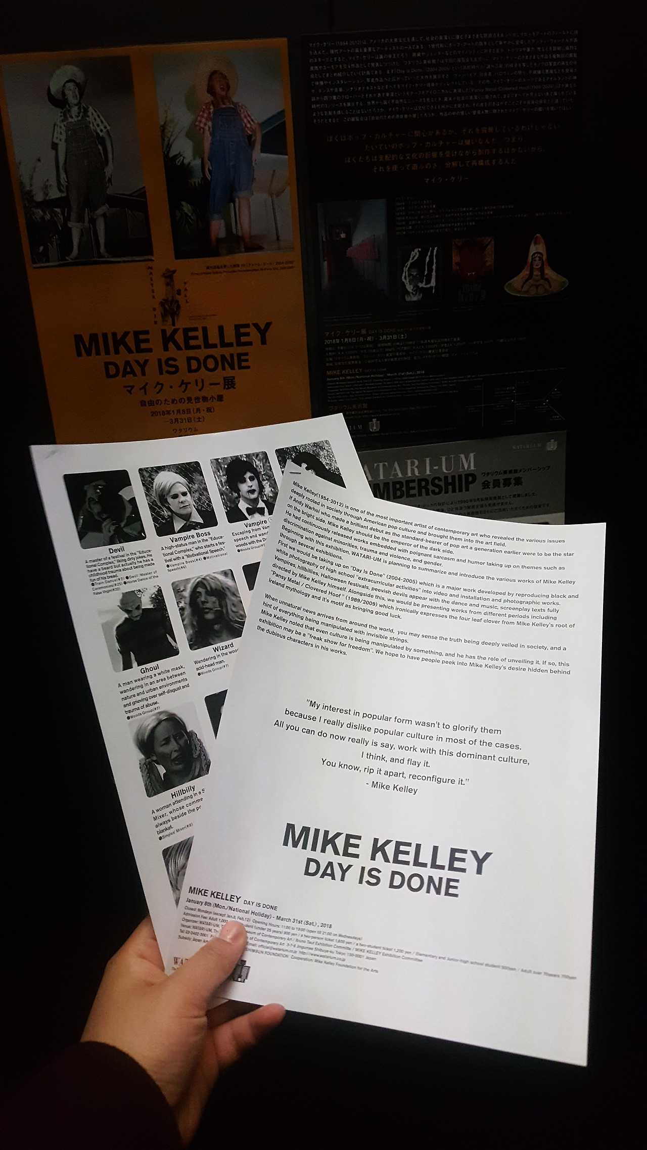 이번 전시 서문의 일부이다. 이를 참고하면 많은 이들이 쉽게 공감할 수 있는 대중문화의 속성을 파고든 앤디워홀과 그것을 비판하며 어두운 이면을 드러낸 마이크 캘리는 분명 반대의 행보를 걸은 듯싶다. 그러나 이들 모두 미국을 대표하는 작가임이 분명하고 덕분에 지난 미국의 시간들을 '역사'로서 정리할 수 있는 기회를 마련했다는 것만큼은 공통점이 아닐까. 그리하여 흐르는 시간이 다양한 방법으로 그들을 평가하고 있고, 미국으로부터 먼 땅인 도쿄에서도 마이크 켈리를 기억하며 전시를 진행할 수 있었다. 와타리움 미술관에서는 단지 이 둘의 비교로서 전시를 해석하는 것이 아니라, 현재 상황에서 대중예술의 위치를 되돌아보고 비판의 정신을 생략하지 않았다.