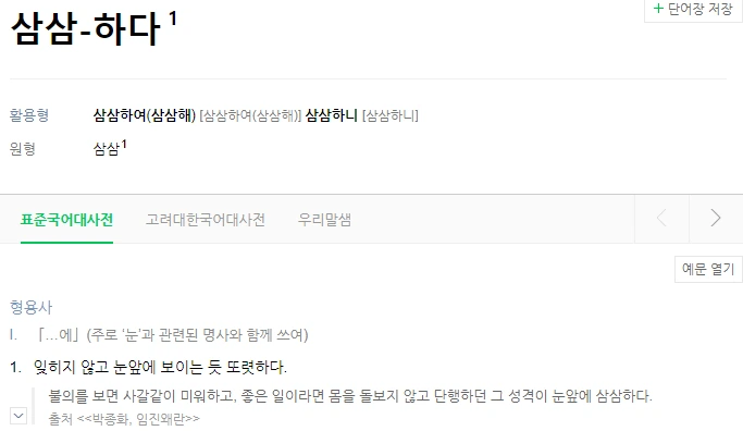 삼삼하다: [형용사] 잊히지 않고 눈앞에 보이는 듯 또렷하다.