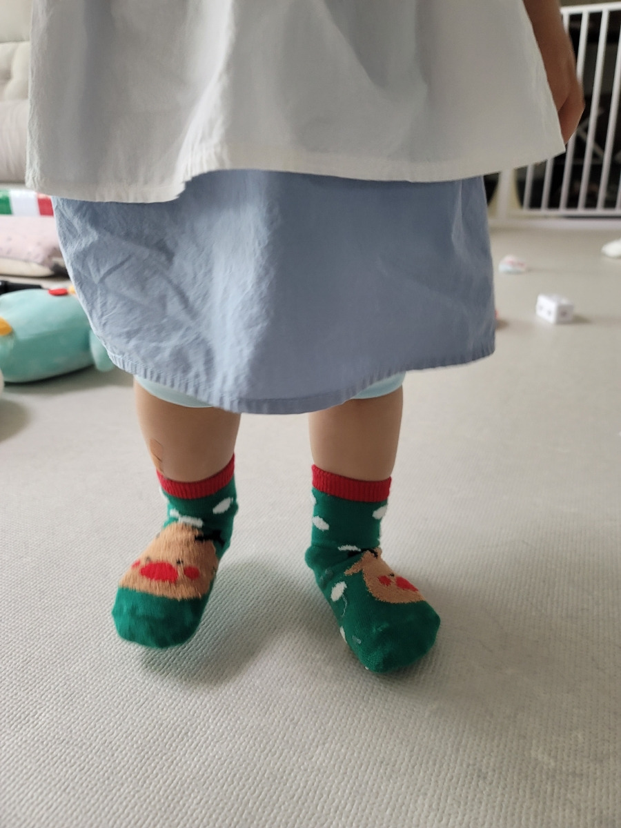 메이드복을 차려 입히는 데는 성공했지만 양말은 끝끝내 사수하지 못했다. 어쩌겠는가 아이가 신고 싶다면 신겨야지. 35도가 넘는 이 여름에 도톰한 크리스마스 양말을 꼬~옥 신어야 하는 방뚱이다. 방뚱이는 유난히 고집이 세다. 특히 등원 전 똥고집은 이길 수가 없다. 시간은 촉박하고 생일날 아침부터 울리기 싫었다. 자식이기는 부모는 없다고 생일날 아침 방뚱이는 초록빛이 찬란한 발로 등원했다.