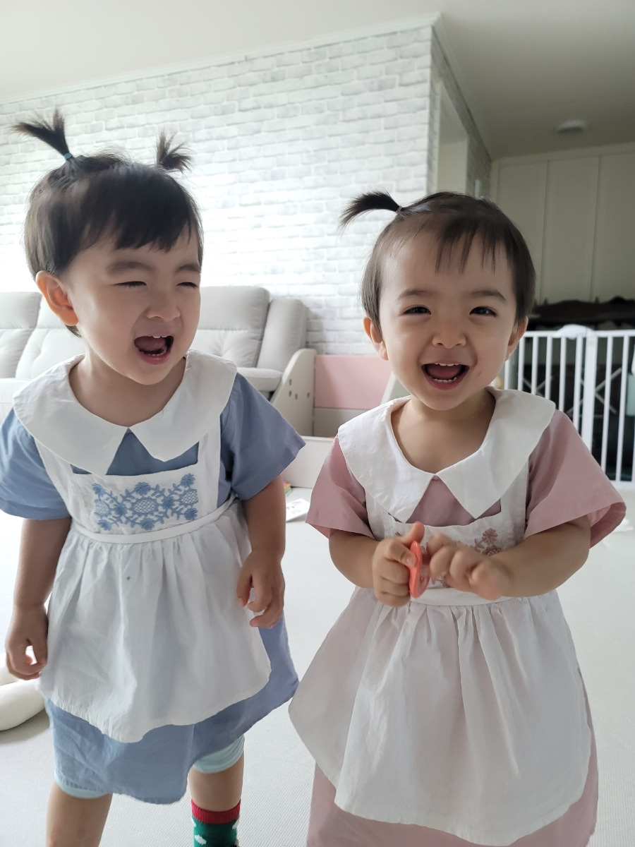 여자아이들의 머리를 미는 일은 정말이지 쉬운 결정은 아니었다. 내 딸들 머리 하나 미는 데에도 양가 어른들의 허락이 필요했다. 그러나, 한 달이 넘는 설득에도 허락은 떨어지지 않았다. 어른들은 여자아이 머리카락은 절대 짧게 잘라서는 안된다고 만류하셨다. 그렇다고 해서 머리채를 쥐어 뜯기는 아이를 방관할 수도 없는 일이었다. 결국, 어른들의 말씀을 무시한 채 이발을 강행해 버렸다. 아이들은 이발을 할 때도 울고 집에 와서도 하루 종일 울었다. 특히 방뚱이는 잊을만하면 떠오르는지 거울 속에 비친 자신의 모습을 보며 한동안 슬퍼했었다. 3개월 동안 많이 기르긴 했지만 여전히 짧은 머리 스타일 덕에 동네 어른들의 대부분은 아들 쌍둥이라고 알고 계신다. 그러나, 우리 딸들은 하늘하늘한 원피스를 좋아하는 천상 여자아이들이다.