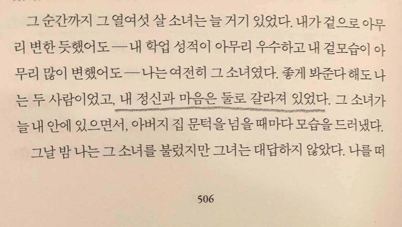 그날 밤 나는 그 소녀를 불렀지만 그녀는 대답하지 않았다. 나를 떠난 것이다. 그 소녀는 거울 속에 머물렀다. 그 이후에 내가 내린 결정들은 그 소녀는 내리지 않을 결정들이었다. 그것들은 변화한 사람, 새로운 자아가 내린 결정들이었다.