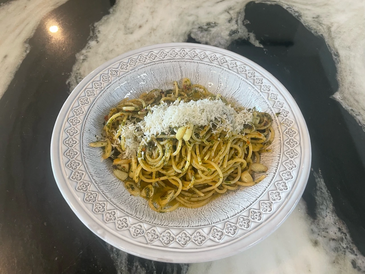 이 파스타는 마늘향이 주요한 역할을 한다는 점에서 익숙한 알리오 올리오와 비슷하다. 그래서 오일에 마늘을 볶는 방식으로 요리를 시작한다. 그렇지만 맛에서 완전히 차이 나는 부분이 있다. 그 주인공은 바로 '레몬즙'이다. 레몬의 새콤한 맛이 다른 재료들과 만나서 이 파스타는 알리오 올리오와 완전히 다른 길로 간다.