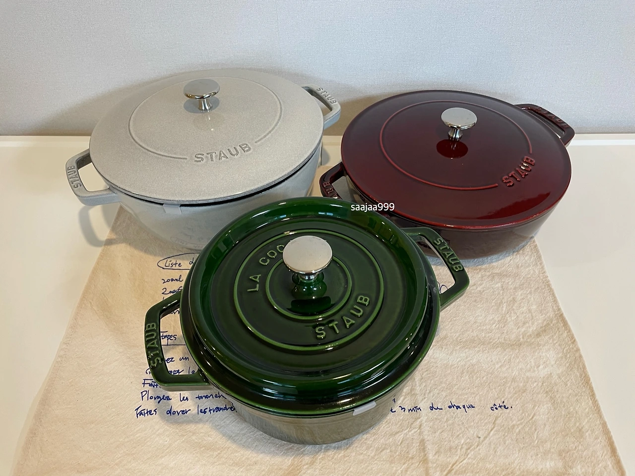 남편과 나는 요리하는 것을 좋아해서 주방 용품에도 관심이 많은 편이다. 주물 냄비는 정말 손이 많이 가는 용품임에도 불구하고 특정 요리에서 탁월한 맛을 느낄 수 있어서 여러 개 사용하고 있다. 예쁜 색감에 반해 스타우브라는 브랜드를 선택했다. 이 냄비는 손이 정말 많이 간다. 처음 사자마자 바로 사용할 수 있는 것이 아니고, '시즈닝'이라는 것을 해야 한다. 오일을 바르고 저온에서 가열한 뒤 키친타월로 닦아 내면 된다. 사용하면서도 주기적으로 시즈닝을 해주는 것이 냄비에 좋다고 한다.