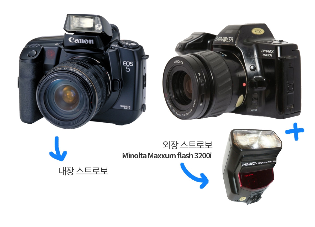 AF SLR의 외관은 DSLR과 유사하다. 나는 Canon EOS 5, Minolta dynax 7000i 모델을 보유하고 있고, 후자가 삼촌이 사용하던 카메라이다. 캐논 같은 경우 스트로보가 내장되어있고, 미놀타 경우에는 외장 스트로보를 따로 구매해야 한다.