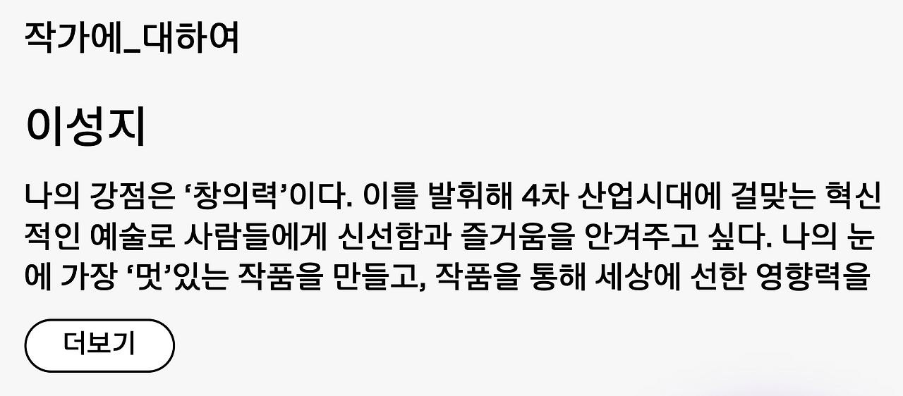 해시태그 형식의 텍스트의 특성은 1) 파란 계열의 색이다 2) 띄어쓰기가 안 되어 _이 스페이스를 대치한다 3) 대체로 짧은 명사형의 텍스트 이다. 하지만 '큐레이터에_대하여'나 '작가에_대하여' 텍스트는 해시태그 형식의 텍스트가 아님에도 '_'가 삽입되어 있다. 해시태그 형식을 차용한 텍스트 디자인이 아니라면 '_'는 불필요하기에 빼는 것이 합리적이다. 불필요한 언더바는 텍스트와 UX writing의 일관성을 해친다.