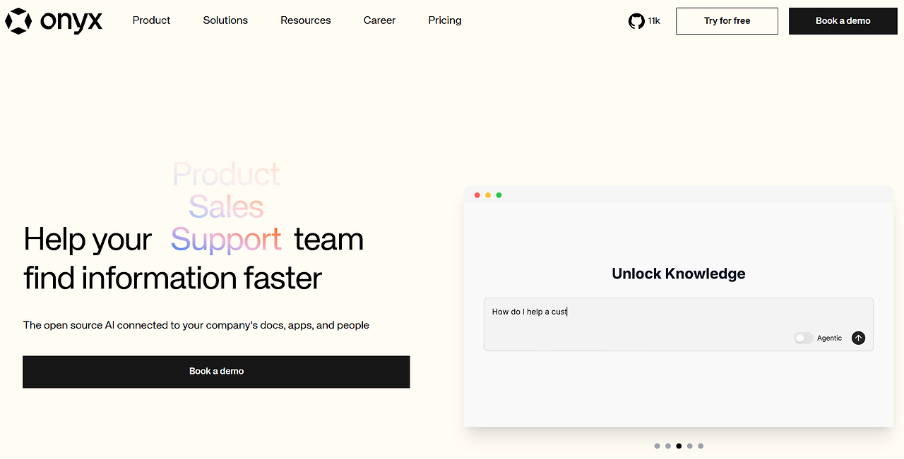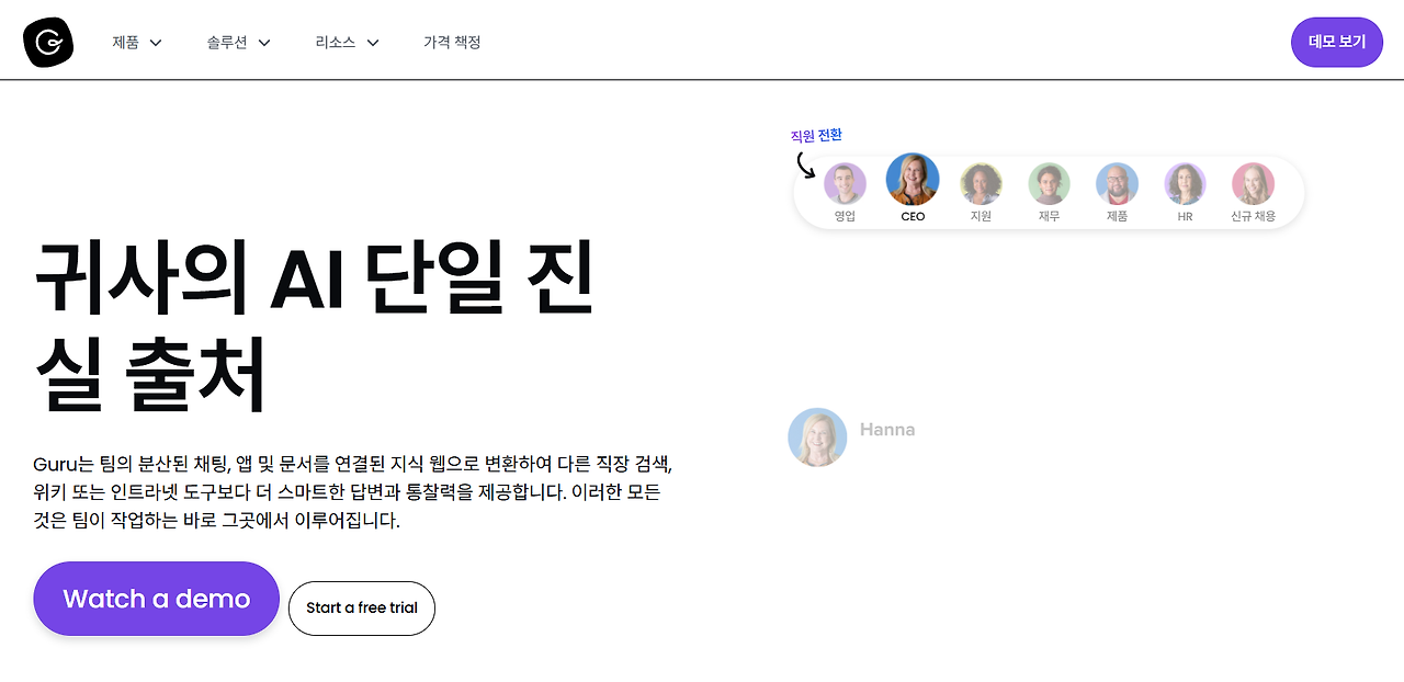 - 특징 : 사용량 당 과금이라는 가격 모델을 채택하고 있고, 응답 답변의 퀄리티가 매우 높습니다. 일반적인 텍스트 - 출력 기반의 AI가 아닌, 저장된 문서의 내용을 읽고 응답을 부드럽게 표현합니다. 다만, 현재는 Glean과 같은 다수 툴과의 통합 연결을 지원하지 않습니다. API 및 SDK를 통해 자체개발로 연결은 가능합니다.