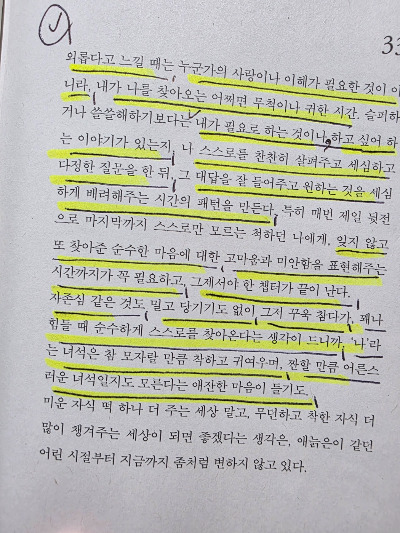 "나는 ~ (중략) 같은 생각, 심지어는 같은 취향의 사람들을 믿고 좋아했다. 그것은 정말이지 큰 나의 해방구였다. 그러나 인생을 살면서 점점 알게 되는 것은, 어떤 사람이 좋은 사람이냐 하는 것은, 그가 어떤 것을 좋아하느냐와는 다른 것이라는 것, 그리고 최종적으로는 어떤 것이 옳다고 그가 믿는가와도 매우 다르다는 것이었다"