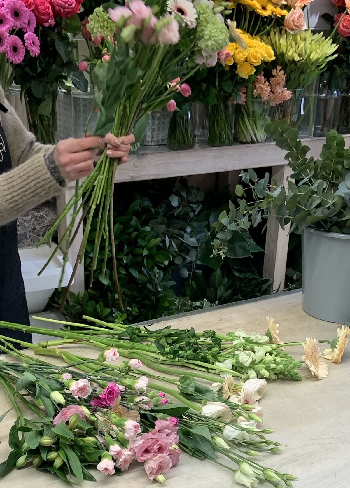 안개꽃, 장미, 라넌큘러스, 거베라, 캄파눌라 등이