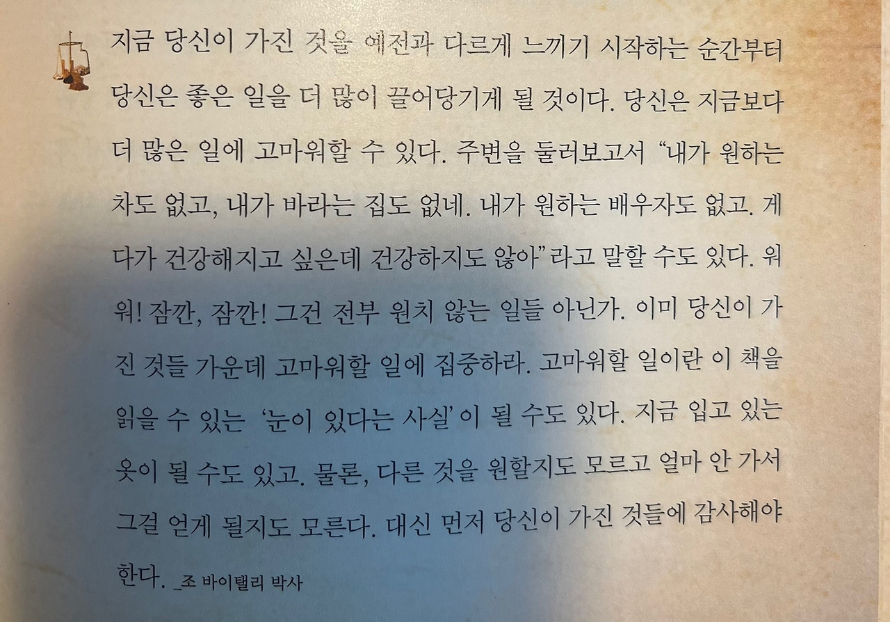좋은 일을 더 잘 끌어당기는 도구는 <시크릿>에서 감사와 시각화(Visualization)를 말하고 있다. 나는 세모에게 매일 지쳐서 '나에게 왜 이런 일이?', '나의 아이에게 왜 ADHD라는 무서운 것이?'라고 생각했었다. 그러나 이 책을 읽으며, 더 이상 나쁜 것들을 끌어당기고 싶지 않아 졌다. 오직 좋은 것만을 끌어당긴다 믿으며 매일 감사할 것을 찾았다. 옆에 있으면서도 몰랐던 것들에 대해, 흘러가고 있던 감사할 것들을 붙잡아 내 도구로 삼았다.