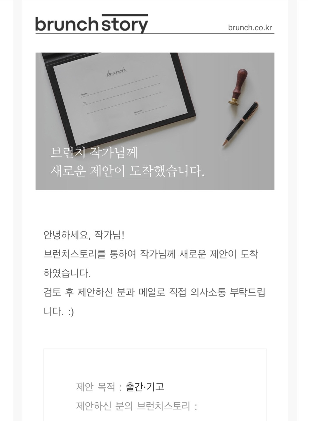 "오늘 내 브런치 제안하기를 통해 출판사에서 '출간 제의'가 올 거야."