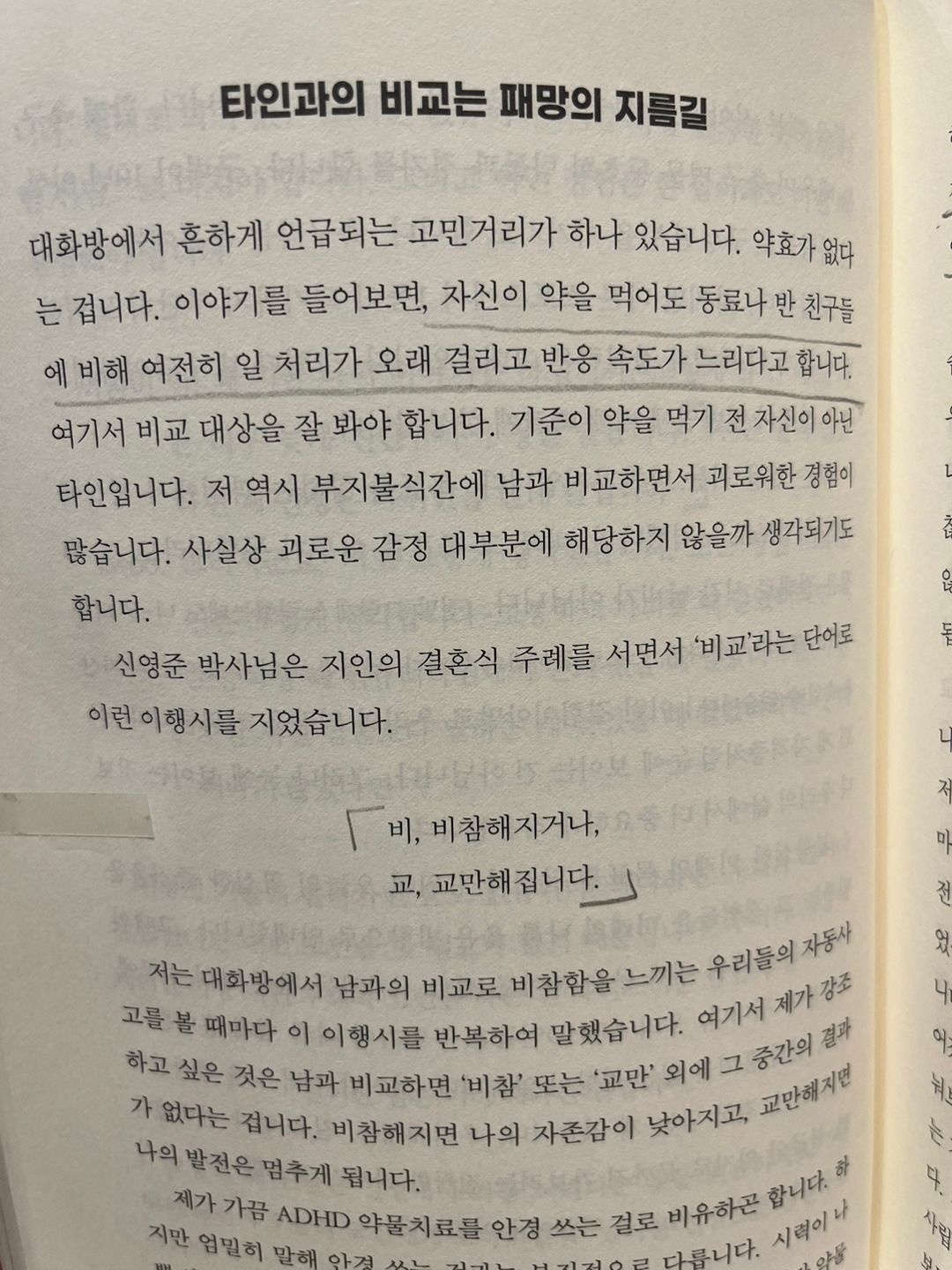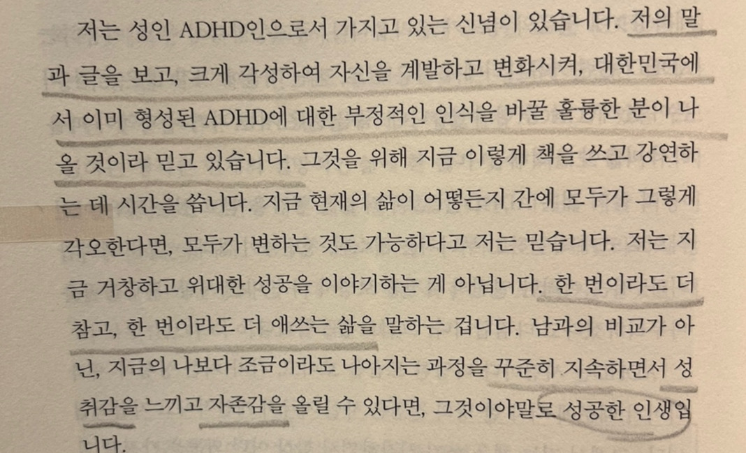 작가는 많은 ADHD인들이 가야 하는 정도를 스스로 부단히 노력하여 찾아냈고, 성인 ADHD인들이 ADHD를 핑계 삼아 회피하지 않길 바라는 마음으로 이 책을 쓴 것이 느껴졌다.