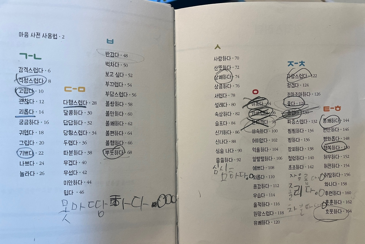 둘째, 그 일에 대한 감정 세 가지 단어를 고르게 하세요. 저는 <아홉 살 마음 사전> 책을 이용했습니다. ADHD 아이는 감정에 대해 언어로 표현하는 것에 서툽니다. 아이의 '화난다'라는 말 안에는 '속상하다' '괴롭다' '아쉬웠다' '아까웠다' 다양한 감정이 들어있는데, '화난다'라는 말로 단순하게 표현하는 아이들입니다. (그래서 독서와 낭독이 이 아이들에게 매우 좋은 이유죠. 어휘가 섬세해질수록, 상대방에게 자신의 마음을 잘 전달할 수 있으니까요.) 목차에서 감정을 고르고 난 후, 그 어휘를 이용해서 일기를 썼습니다.