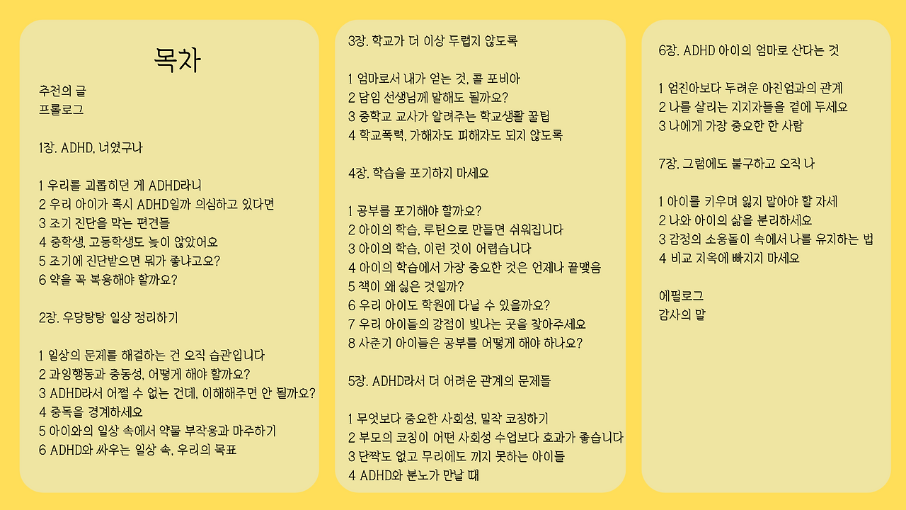 이 책을 통해 ADHD 아이를 키우며 얻은 경험과 교직에서 경험한 통찰을 학교가 어렵고 두려운 부모들과 나누고 싶습니다. ADHD 아이를 키워내는 온 마을의 부모님, 선생님께 감사드립니다. 그리고 자신을 키워내느라 애쓰고 있을 우리 ADHD 아이들, 제 인생에 찾아온 학생들에게도 모두 감사합니다.