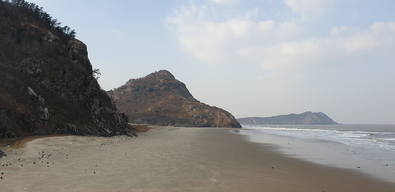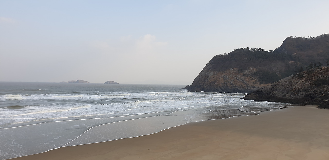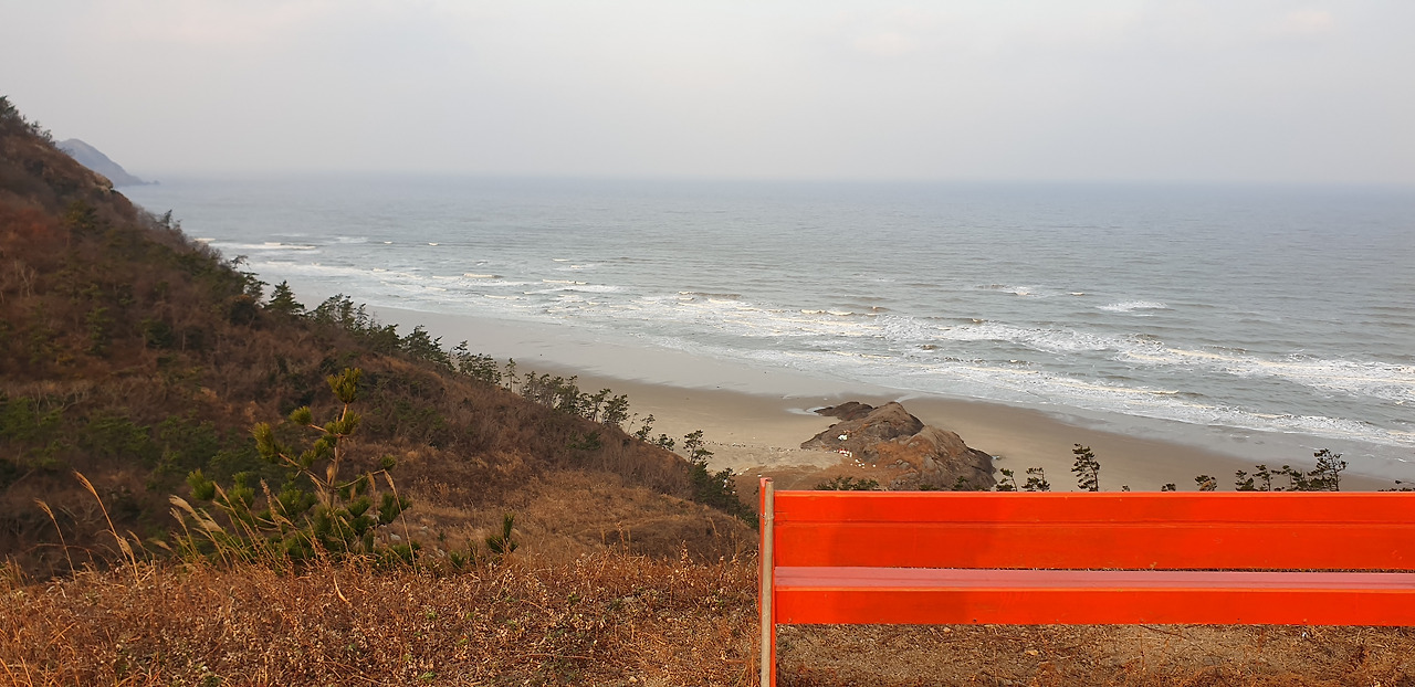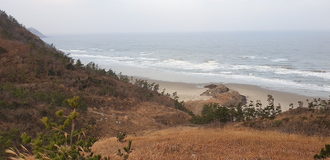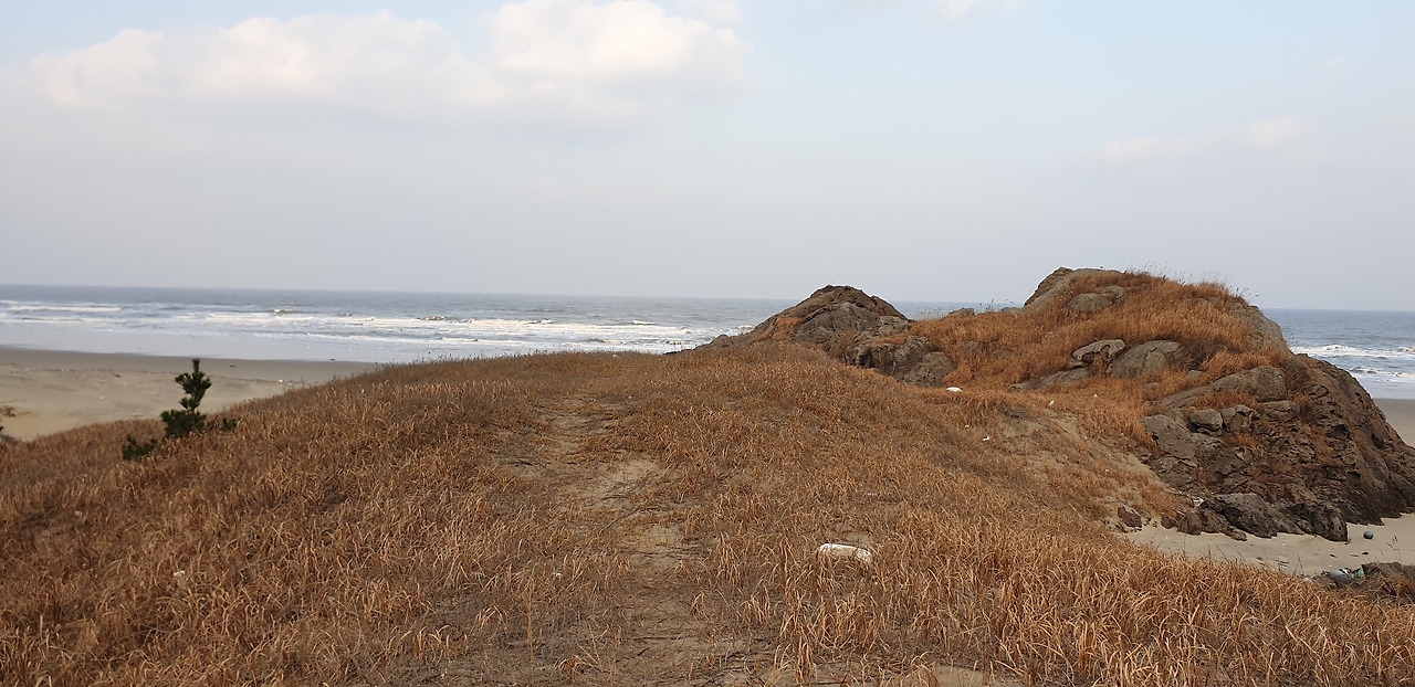 진리 마을에서 산으로 올라가는 방향에 우측으로 띠밭너머 해변을 가는 갈래길이 있다. 이정표가 없으니 우측으로 올라가는 길이 있는지 유심히 살펴야 한다, 언덕을 올라가면 아래로 띠밭이 펼쳐지고 그 너머로 띠밭너머 해변이 보인다, 언덕에 올라서야 해변을 확인할 수 있어 거기에 해변이 있으라고는 상상을 할 수 없어 언덕을 올라서야 해변이 파나로마처럼 보이는 광경이 극적이다.